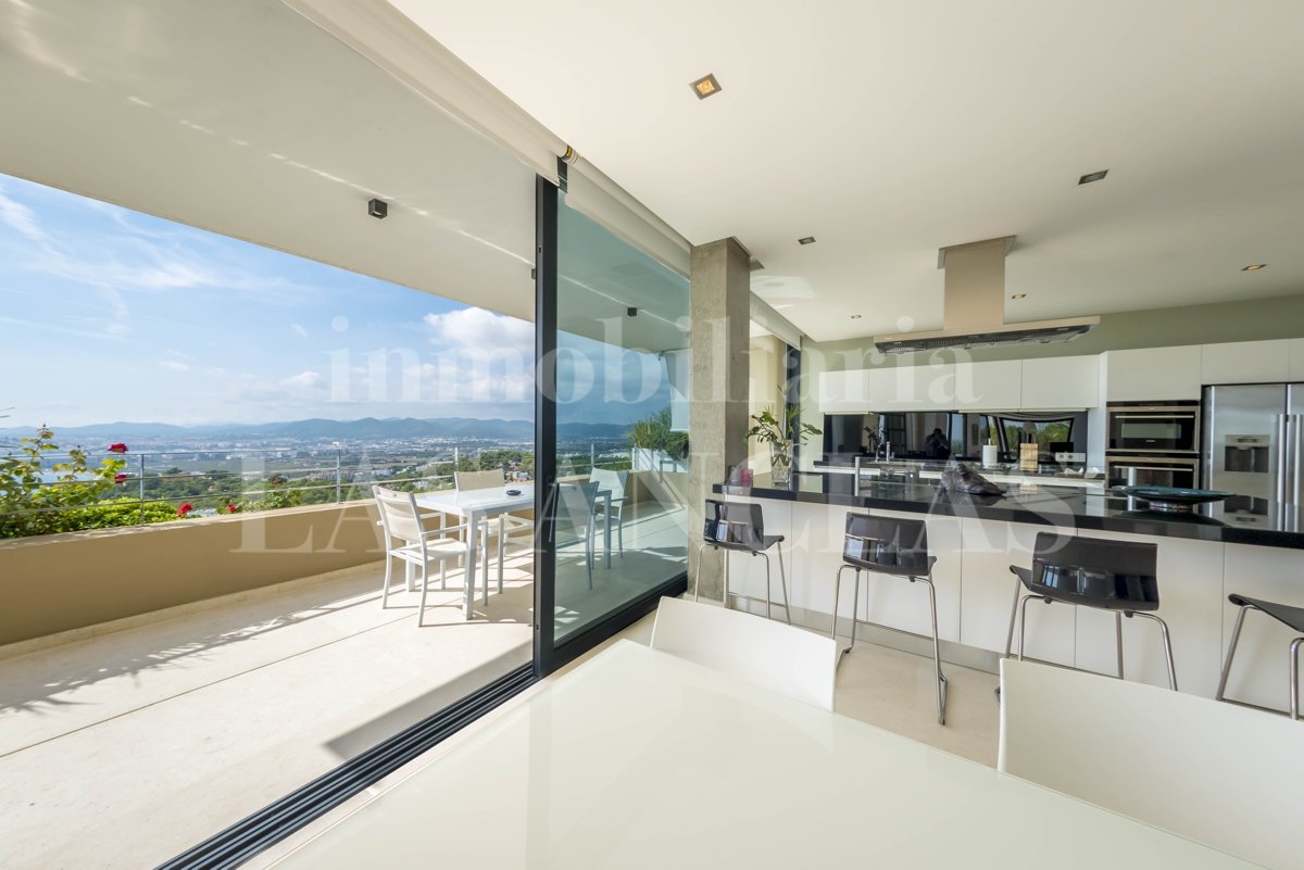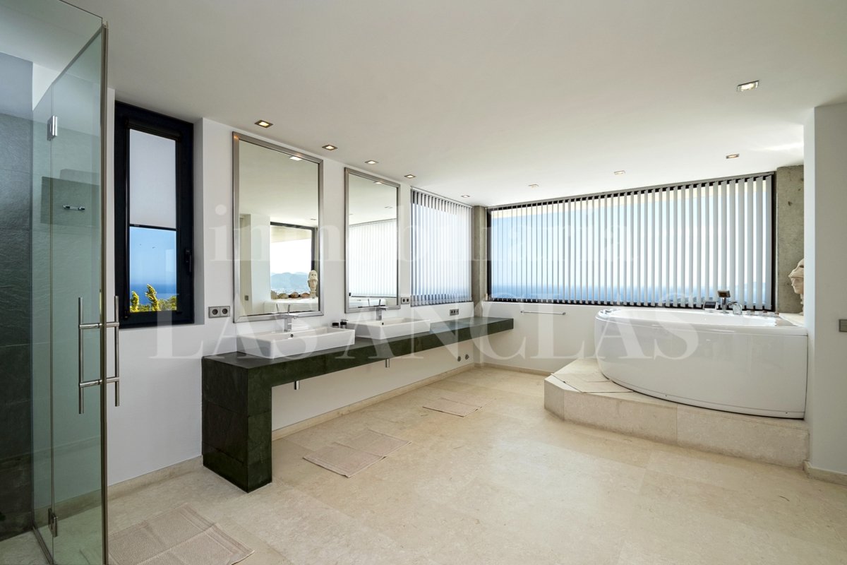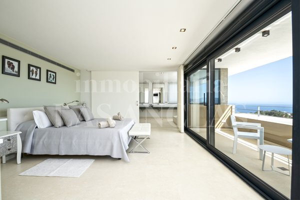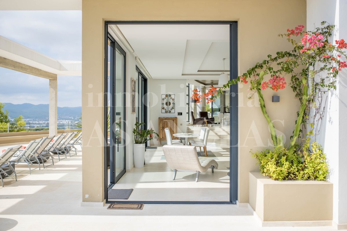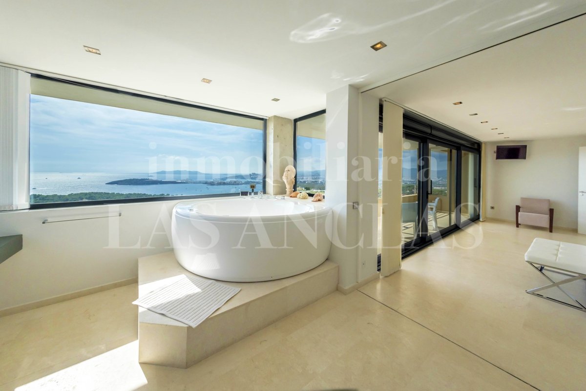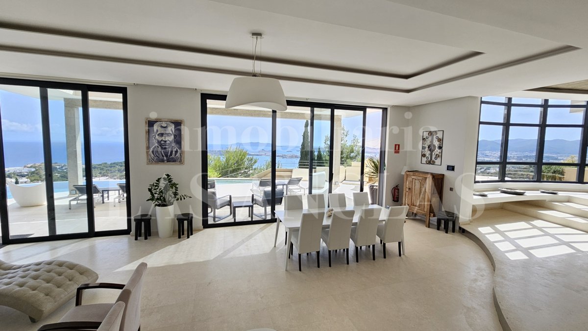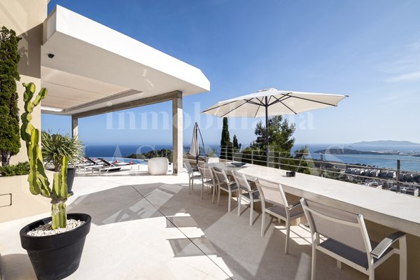 In einer der exklusivsten Gegenden der Insel, in der Nähe des Strandes Talamanca und des Yachthafens Marina Botafoch, befindet sich diese luxuriöse Designervilla mit einer touristischen Vermietungslizenz und einem spektakulären 180º-Panoramablick auf das Meer, den Hafen, die Altstadt von Ibiza und Formentera, die ihresgleichen sucht.
