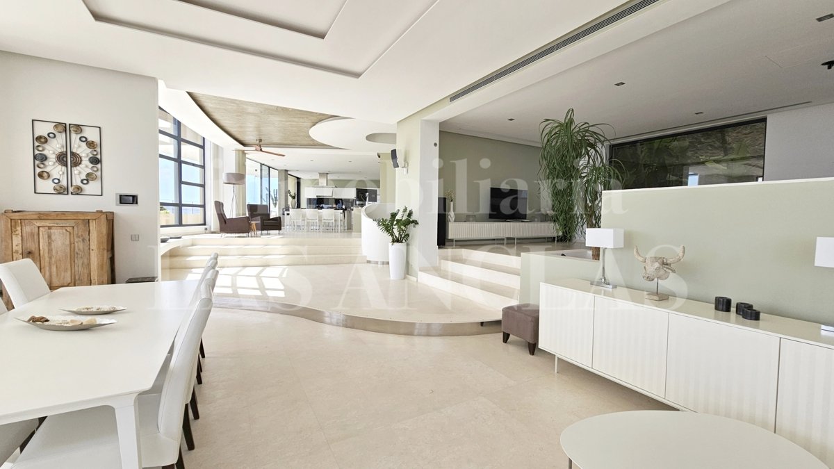 In einer der exklusivsten Gegenden der Insel, in der Nähe des Strandes Talamanca und des Yachthafens Marina Botafoch, befindet sich diese luxuriöse Designervilla mit einer touristischen Vermietungslizenz und einem spektakulären 180º-Panoramablick auf