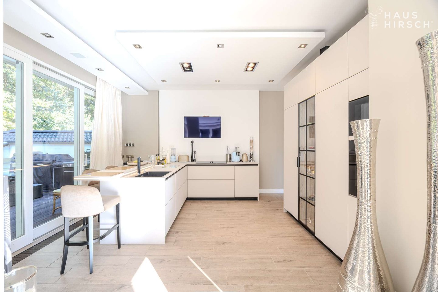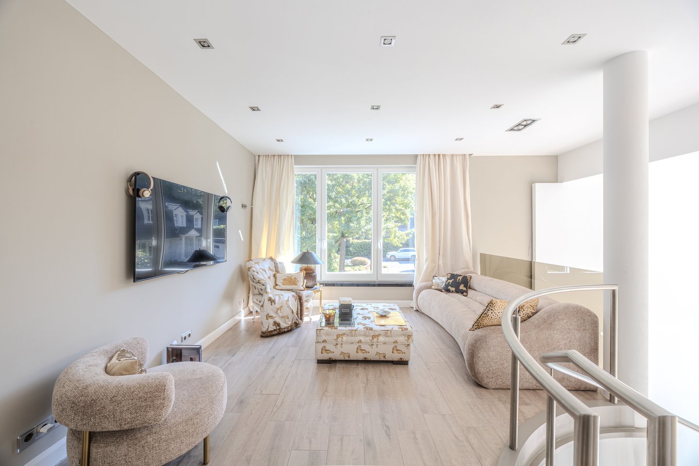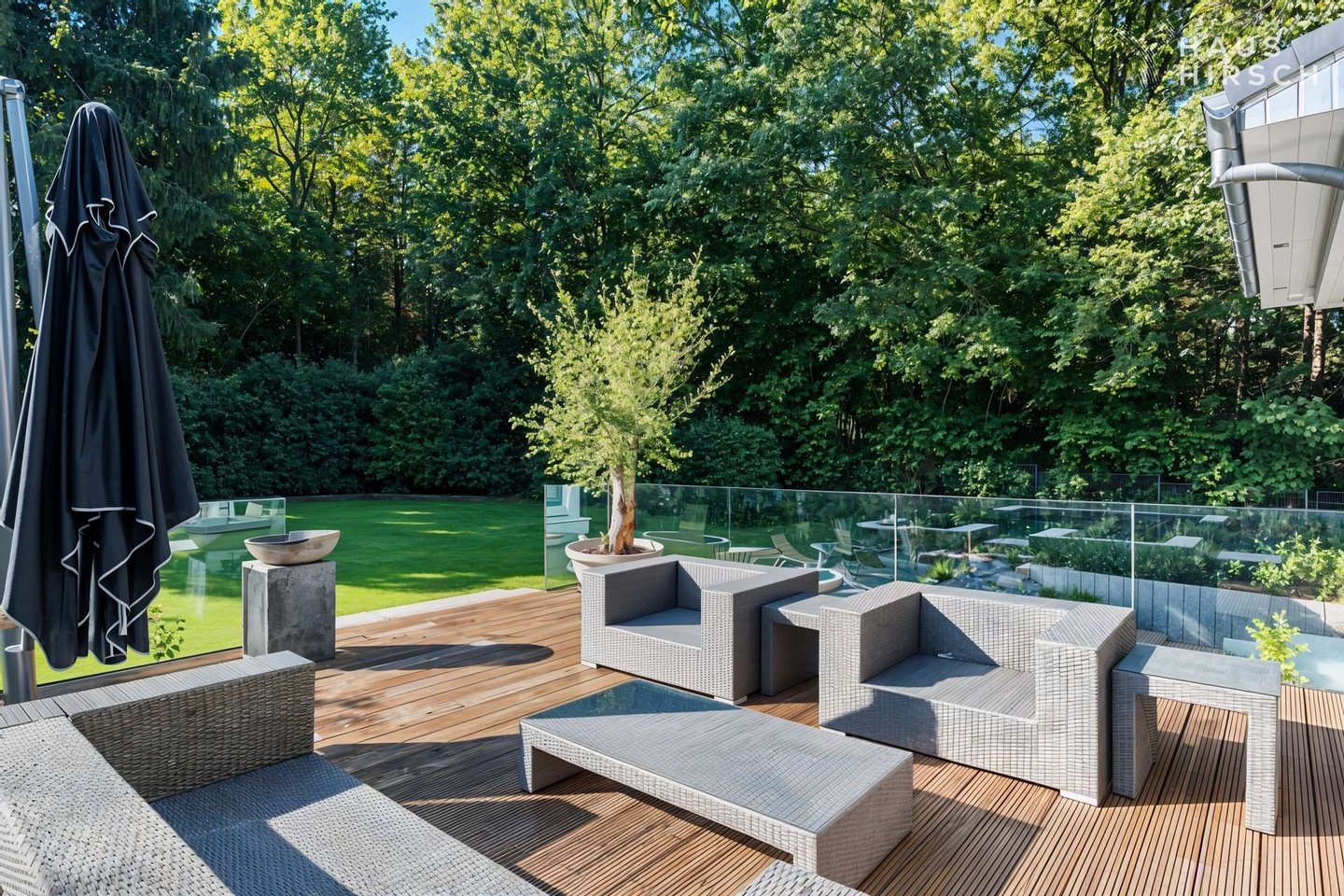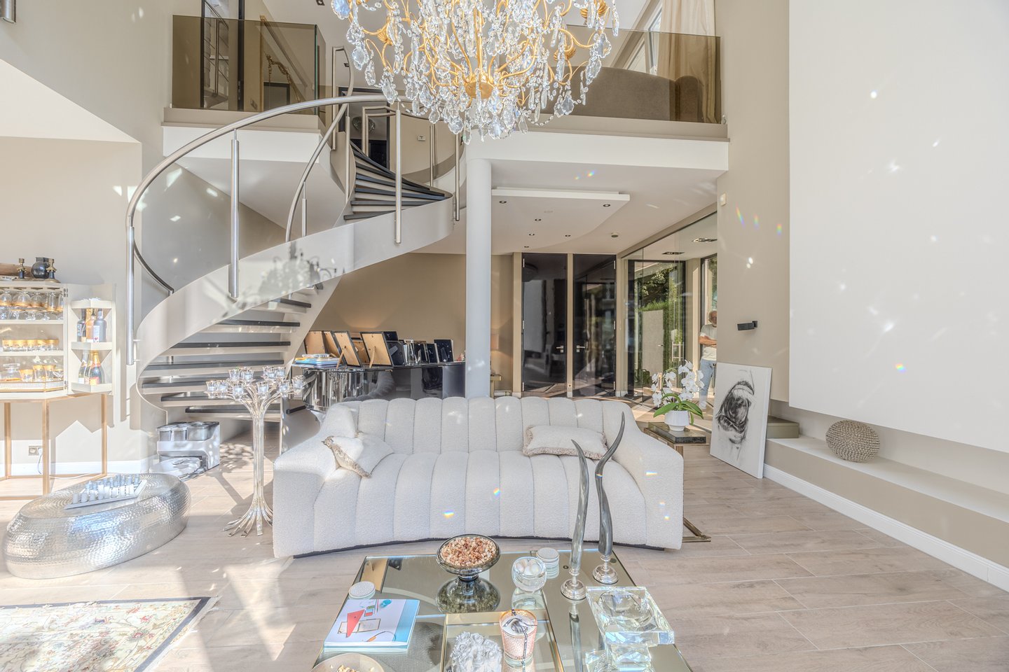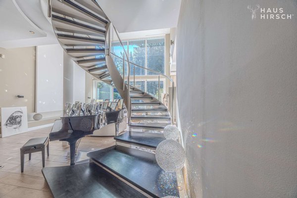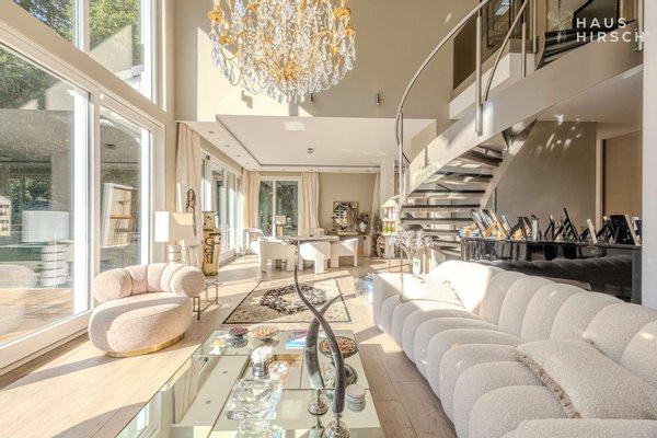 Lichtdurchflutete Räume und eine offene Architektur mit einer imposanten Wendeltreppe schaffen ein Gefühl von Freiheit und Weite. Ob beim gemütlichen Beisammensein am Kamin, entspannten Stunden in der privaten Wellness-Sauna oder beim Blick von einer der vier Sonnenterrassen über das über 2.000 m² große Parkgrundstück – hier genießen Sie absolute Privatsphäre in einer der begehrtesten Lagen Hamburgs.