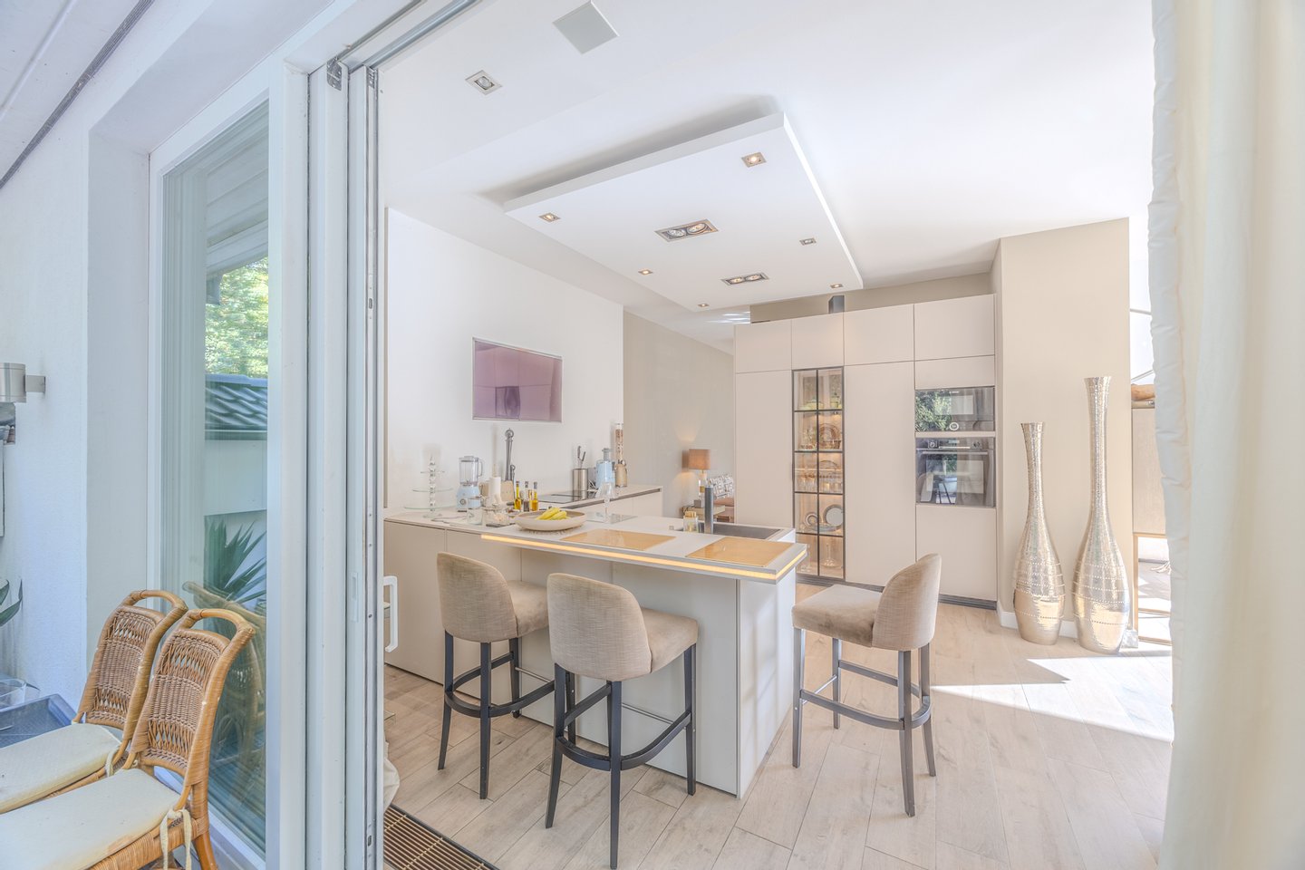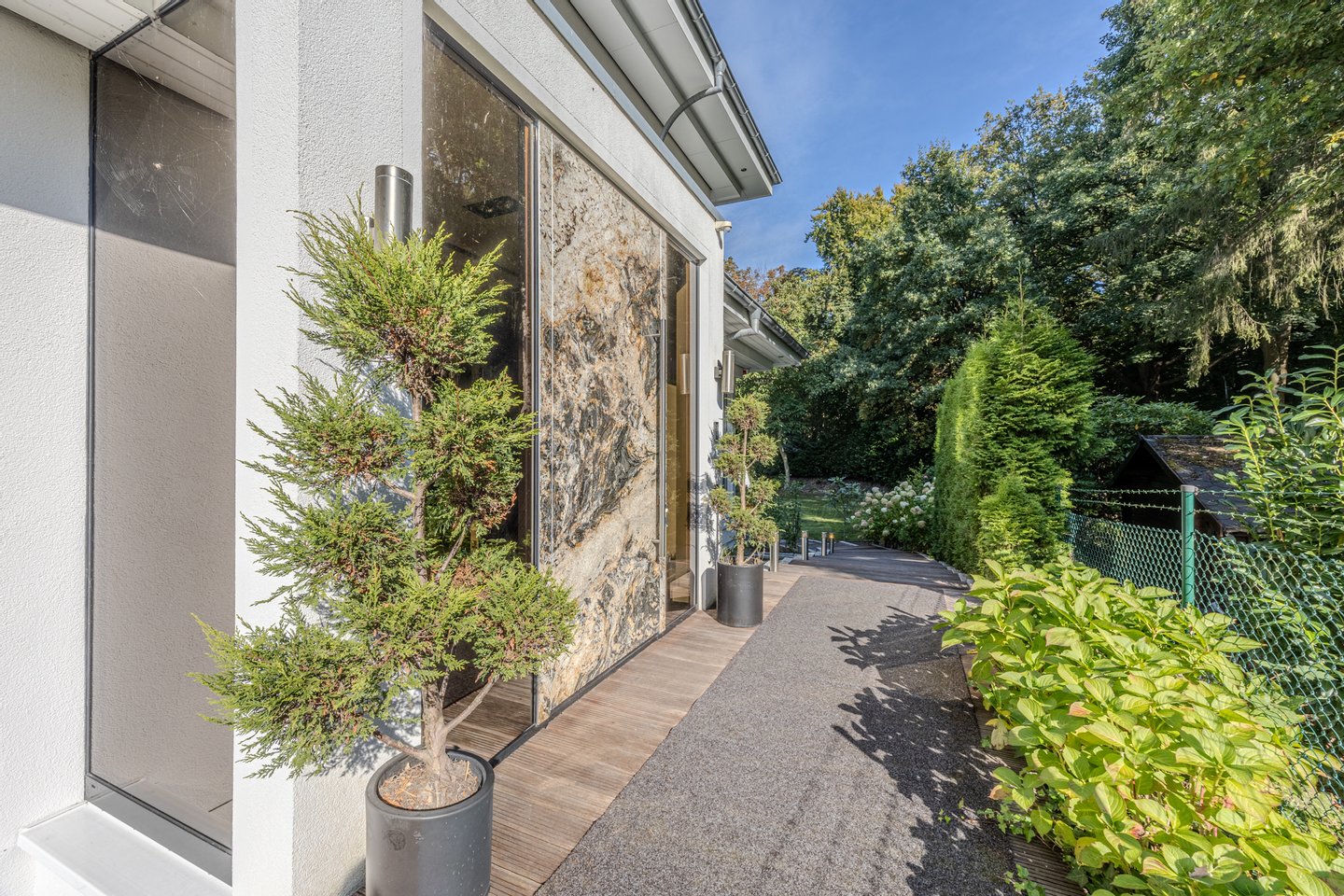 Ein besonderes Highlight ist die durchdachte Architektur mit zwei separaten Hauseingängen, die eine perfekte Trennung in zwei eigenständige Einheiten ermöglicht – ideal für ein Mehrgenerationenwohnen, ein Au-pair oder die ungestörte Integration von Homeoffice und privatem Leben. Der luxuriöse Lebensraum setzt sich im Freien nahtlos fort: Erleben Sie unvergessliche Momente auf den vier Sonnenterrassen, die mit über 212 m² den Wohnraum elegant erweitern, während Ihre Kinder unbeschwert im Garten spielen. Als letztes Haus in der Reihe genießen Sie hier eine absolute und seltene Privatsphäre.