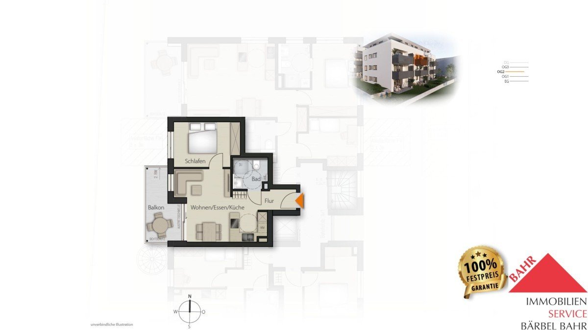 Diese ca. 44 m² große 2-Zimmer-Wohnung im 2. Obergeschoss steht für ein modernes Wohngefühl in konzentrierter Form. Zwei klar gegliederte Räume, ein offener Lebensbereich und eine angenehme Außenfläche schaffen ein Zuhause, das leicht wirkt – und gleichzeitig Substanz hat.