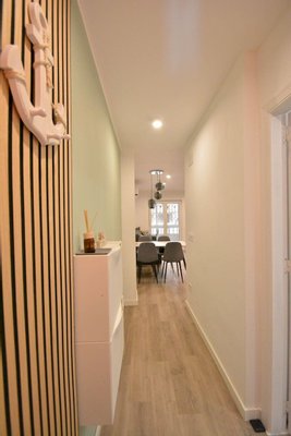 Diese renovierte Erdgeschosswohnung hat eine konstruierte Fläche von 57 m², davon sind 44 m² nutzbare Innenfläche und 15 m² Terrasse. Sie verfügt über zwei Schlafzimmer und ein Badezimmer. Die Küche ist offen gestaltet und mit dem Wohnbereich