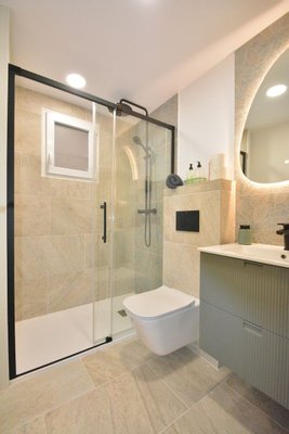 Die Wohnung wurde komplett renoviert und mit neuen Elementen ausgestattet, darunter Fußböden, Sanitäranlagen, Elektroinstallationen, Fenster, Küchenausstattung, Möbel und Haushaltsgeräte. Das Badezimmer verfügt über eine Fußbodenheizung, und im Hauptschlafzimmer ist die Vorinstallation für eine Fußbodenheizung bereits vorhanden. In jedem Zimmer sind brandneue Klimaanlagen installiert.