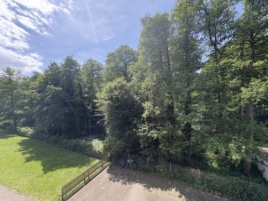 Vom Wohn-/Essbereich aus betreten Sie den überdachten Balkon mit Südwest-Ausrichtung, der einen schönen Blick in den Wald bietet.