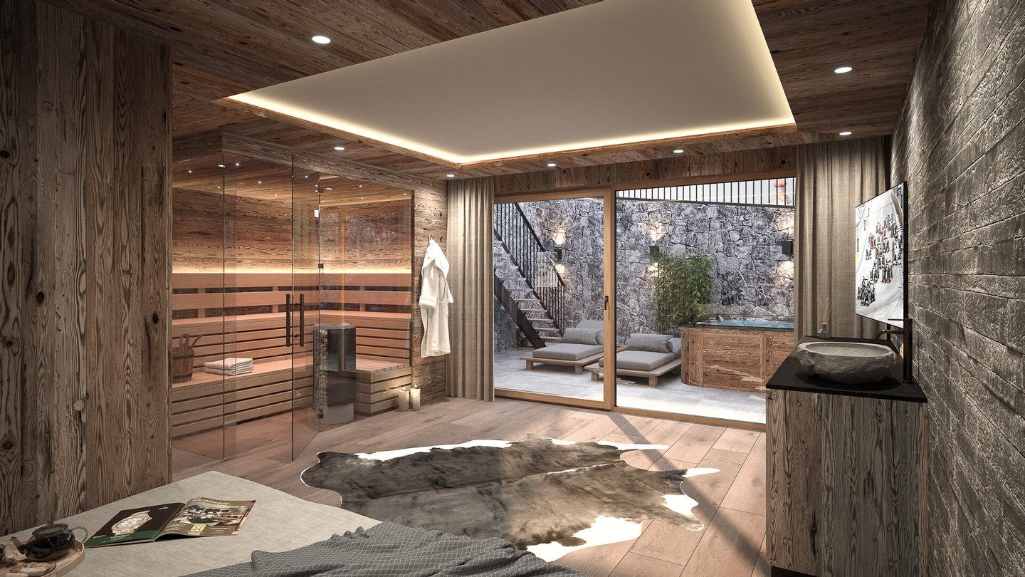Sie gelangen bequem mit Ihrem PKW im Untergeschoss in die knapp 60 m² große Doppelgarage, von hier aus betreten Sie den Eingangsbereich des Chalets. Weiters teilt sich diese Ebene wie folgt auf, in ein Gästezimmer mit Bad en Suite, dem Wellnessbereich mit Ruheraum, Sauna, Dusche und einem Lichthof mit Jacuzzi. Weiters befindet sich auf dieser Ebene der Technikraum und der Hauswirtschaftsraum der Liegenschaft.