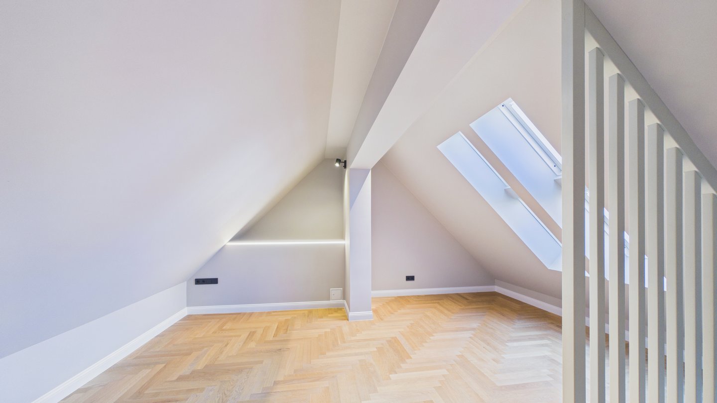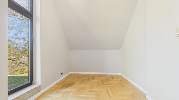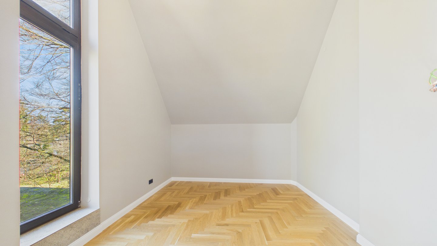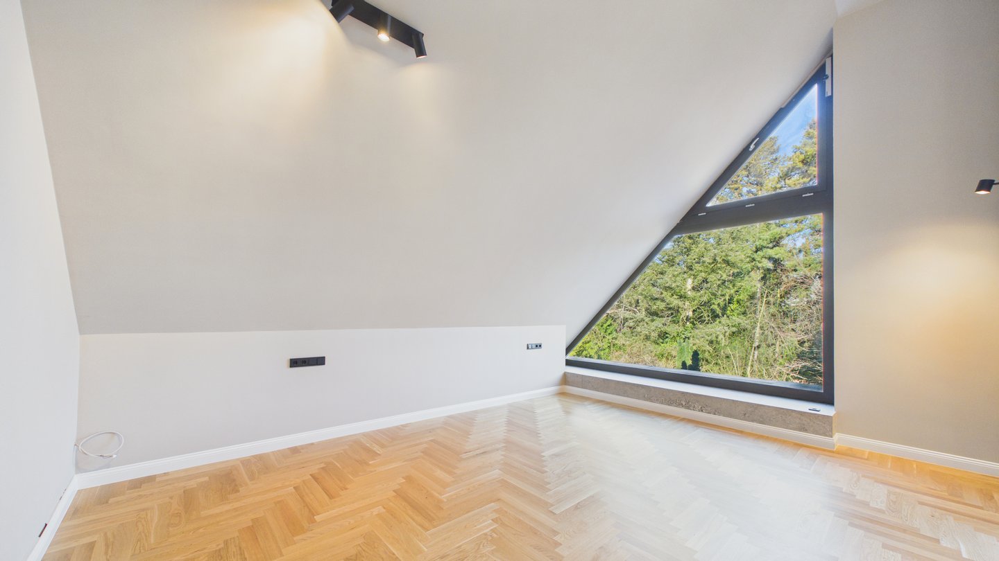 Im oberen Bereich befindet sich das Master-Schlafzimmer mit einem eigenen begehbaren Kleiderschrank. Ein zweites Zimmer mit Balkon und exklusivem Zugang zum Dachboden bietet Platz für ein Kinderzimmer mit Spielmöglichkeiten.