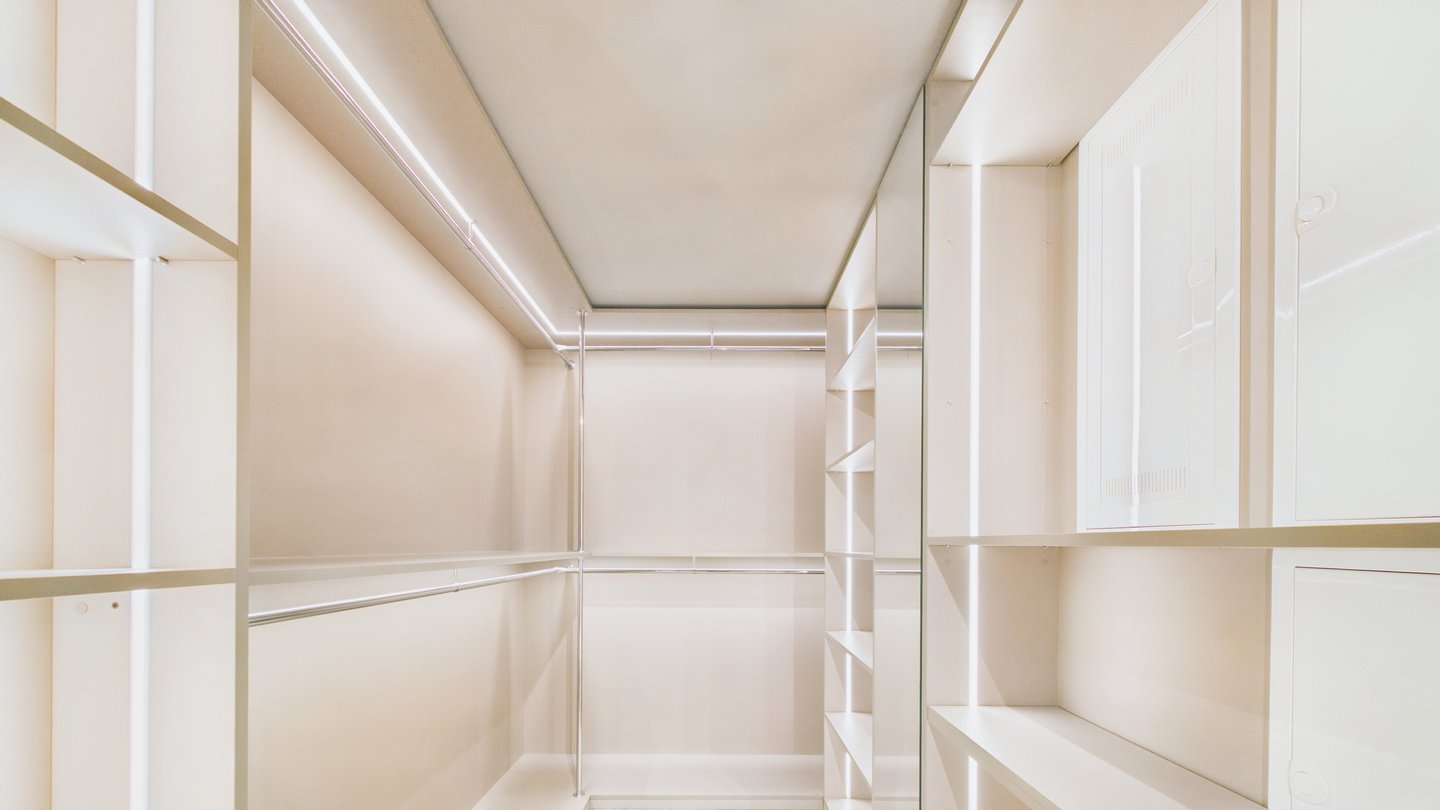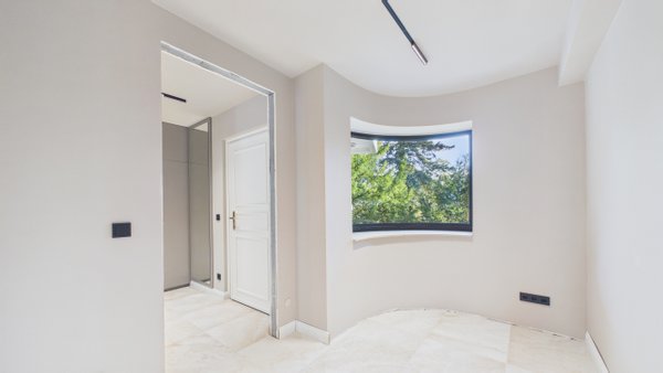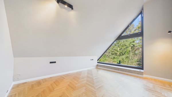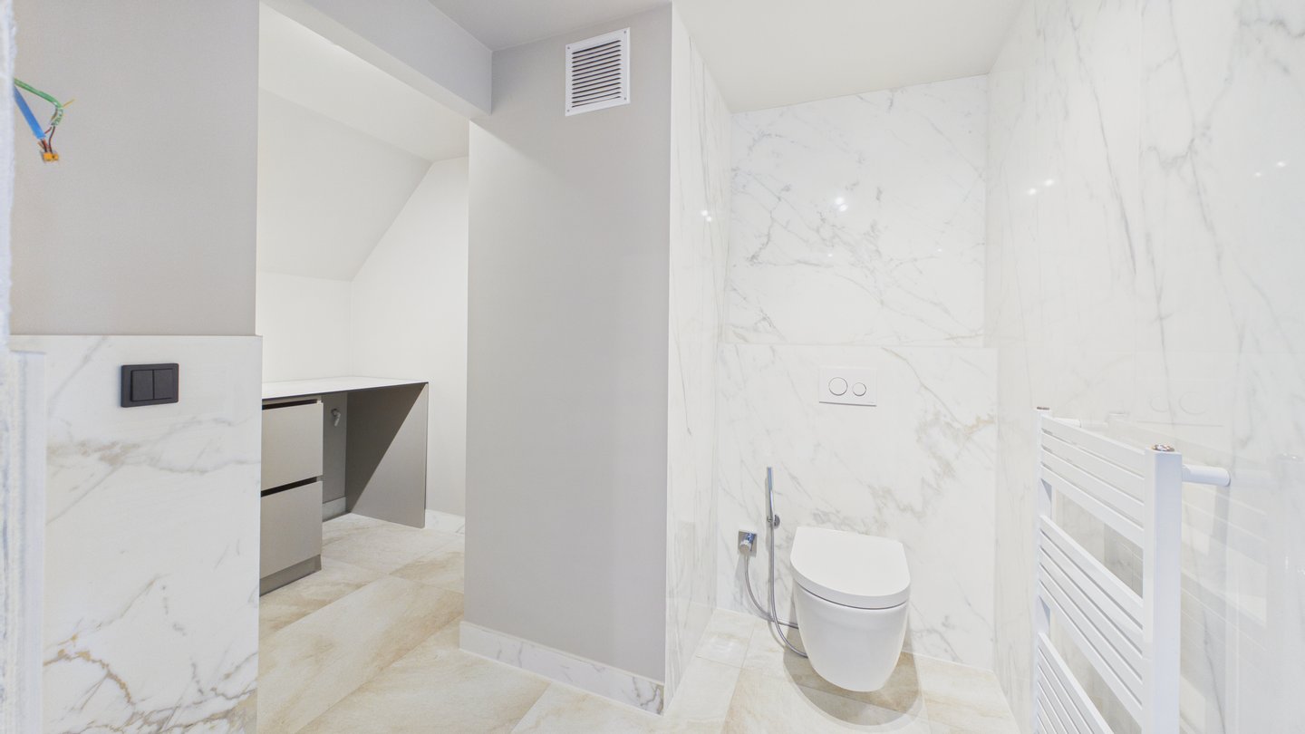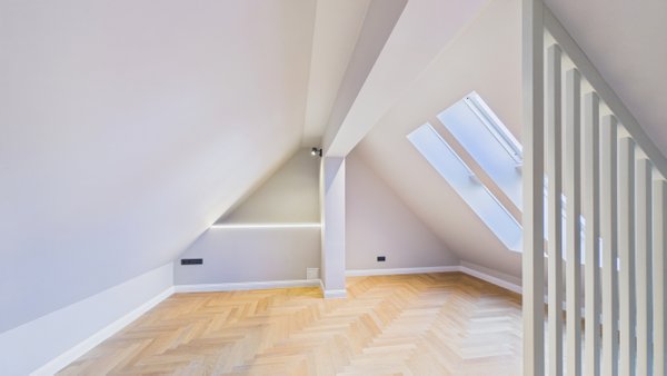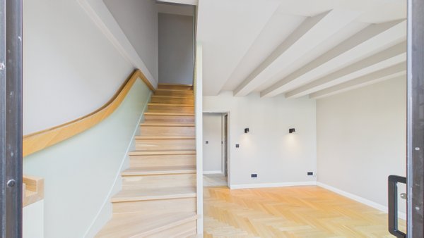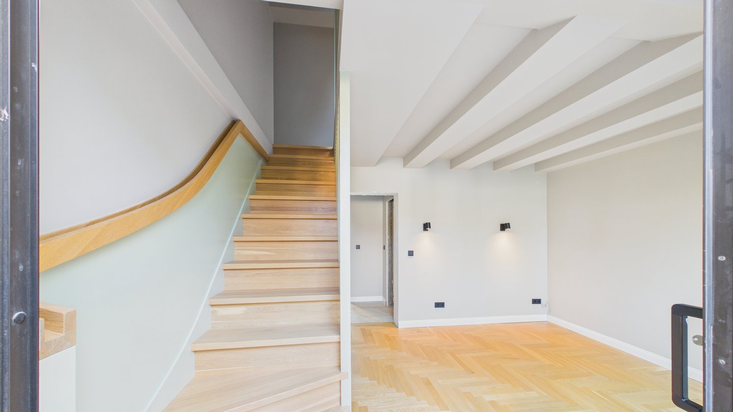 Im oberen Bereich befindet sich das Master-Schlafzimmer mit einem eigenen begehbaren Kleiderschrank. Ein zweites Zimmer mit Balkon und exklusivem Zugang zum Dachboden bietet Platz für ein Kinderzimmer mit Spielmöglichkeiten.