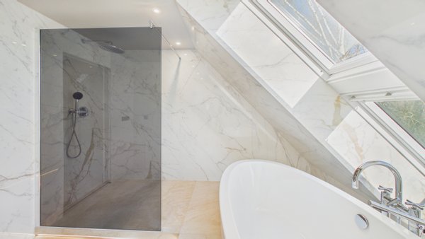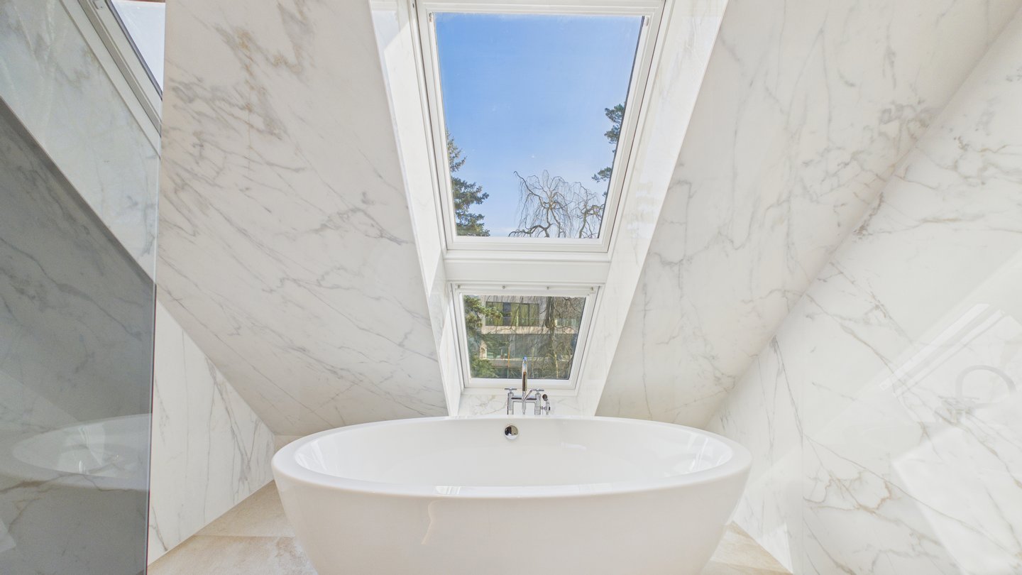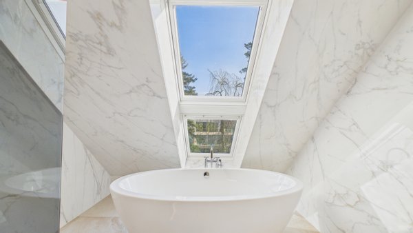 Das Badezimmer beeindruckt mit einer freistehenden Badewanne und einer begehbaren Dusche mit Regendusche. Zusätzlich gibt es ein separates WC und eine Waschküche.