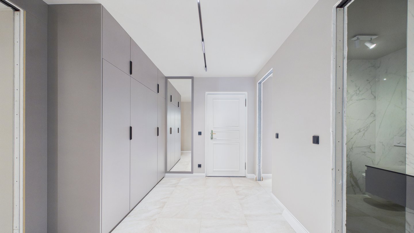 Betritt man die großzügigen Eingangsbereich in der ersten Etage des Hauses, fällt einem sofort der begehbare Kleiderschrank für die Garderobe ins Auge. Das Wohnzimmer, das Herzstück der Wohnung, besticht durch eine großflächige Fensterfront mit Blick ins Grüne und bietet Platz für eine offene Wohnküche mit großzügigem Essbereich.