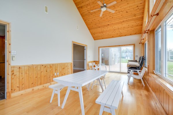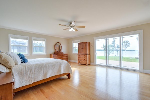 Outdoor-Oase: Die Außenfassade dieses außergewöhnlichen Anwesens ist ebenso beeindruckend, mit angelegten Anlagen, die die natürliche Schönheit der Umgebung verstärken. Genießen Sie einen Panoramablick auf den See vom weitläufigen Deck, perfekt zum Essen im Freien, zum Bewirten oder einfach zum Entspannen, während Sie die atemberaubenden Sonnenuntergänge über dem See genießen und beobachten, wie die Boote in den St.-Peters-Passage zum Meer fahren.