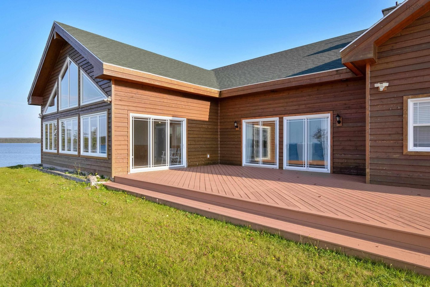 Outdoor-Oase: Die Außenfassade dieses außergewöhnlichen Anwesens ist ebenso beeindruckend, mit angelegten Anlagen, die die natürliche Schönheit der Umgebung verstärken. Genießen Sie einen Panoramablick auf den See vom weitläufigen Deck, perfekt zum Essen im Freien, zum Bewirten oder einfach zum Entspannen, während Sie die atemberaubenden Sonnenuntergänge über dem See genießen und beobachten, wie die Boote in den St.-Peters-Passage zum Meer fahren.