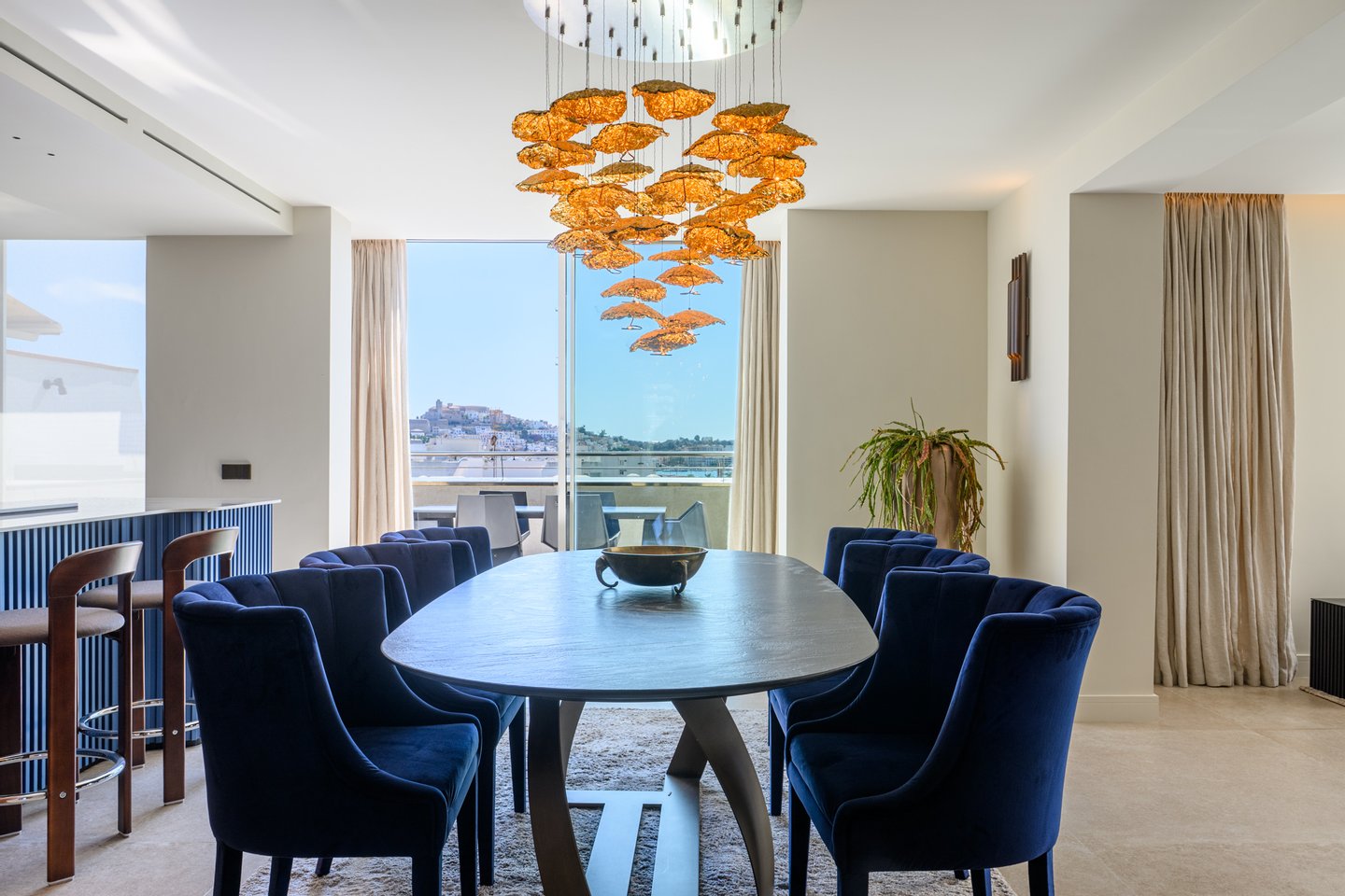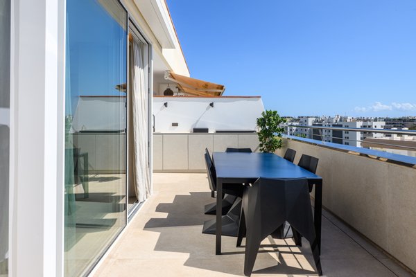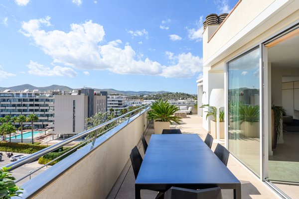 The true highlight is the spectacular 150 m² terrace, a private outdoor sanctuary that surrounds the entire apartment. From sunrise breakfasts to sunset gatherings, it is fully equipped with an outdoor kitchen, barbecue and shower, becoming the perfect setting for entertaining friends or enjoying total tranquility. The views are simply unmatched: a sweeping panorama of Dalt Vila, the Mediterranean and even Formentera, offering postcard-worthy moments at every glance.