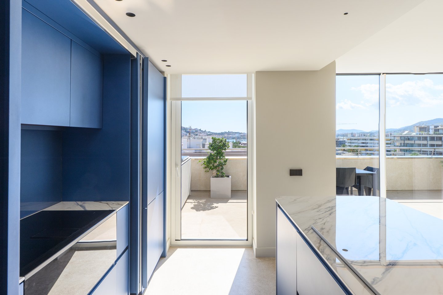 The apartment offers 175 m² of fully redesigned interiors, where natural light and open spaces flow seamlessly together. The living and dining areas merge with an open-plan kitchen, conceived not only as a functional space but also as a central point with views over the island’s most iconic landmarks. The three double bedrooms face Talamanca beach, offering a peaceful atmosphere, while the master suite provides privacy and comfort with its own en-suite bathroom. A guest toilet and a laundry room complete the interior layout.