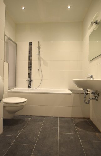 Bad mit Wanne, Innenliegendes Bad (kein Fenster), Boden: Fliesen/Stein
