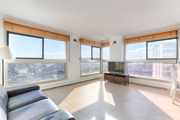 Paris XV – Quai André Citroën, unweit des Einkaufszentrums Beaugrenelle, in einem Gebäude mit 24/7-Conciergerie, hohes Stockwerk, ca. 80 m² Wohnfläche mit Panoramablick auf Paris. Besteht aus Eingang mit Einbauschränken, Eck-Wohnzimmer mit viel