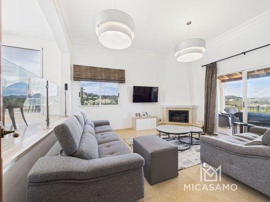 Auf der mittleren Etage befinden sich das Esszimmer und die moderne, voll ausgestattete Küche. Ein paar Stufen hinunter führt das Wohnzimmer mit Terrassentüren auf die große Terrasse, von der aus man eine fantastische Aussicht hat, sowie einen Chillout-Bereich und einen Essbereich im Freien.