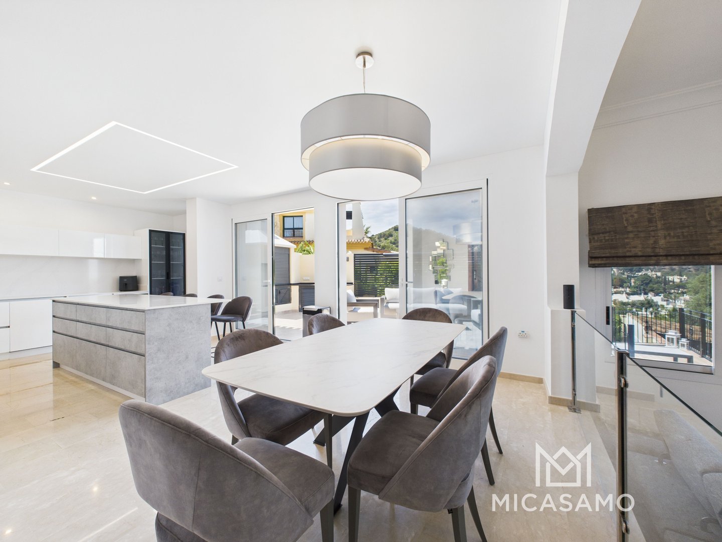 Auf der mittleren Etage befinden sich das Esszimmer und die moderne, voll ausgestattete Küche. Ein paar Stufen hinunter führt das Wohnzimmer mit Terrassentüren auf die große Terrasse, von der aus man eine fantastische Aussicht hat, sowie einen Chillout-Bereich und einen Essbereich im Freien.