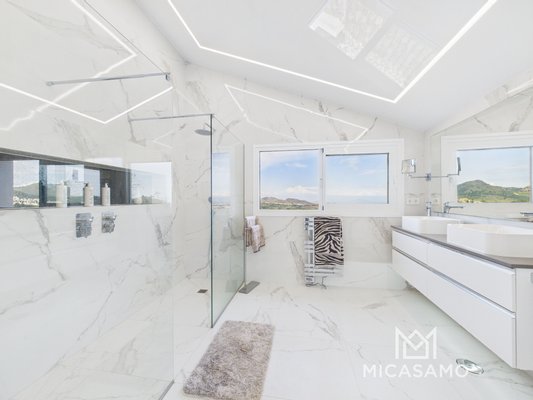 Diese Villa ist über drei Ebenen mit einem atemberaubenden geräumigen Hauptschlafzimmer auf der obersten Etage mit vom Boden bis zur Decke reichenden Glastüren, um einen Panoramablick zu bieten, neben einem Wohnbereich, so dass Sie die Aussicht genießen können, während Sie sich entspannen, das Schlafzimmer hat auch einen Ankleidebereich und ein großes Bad en suite.