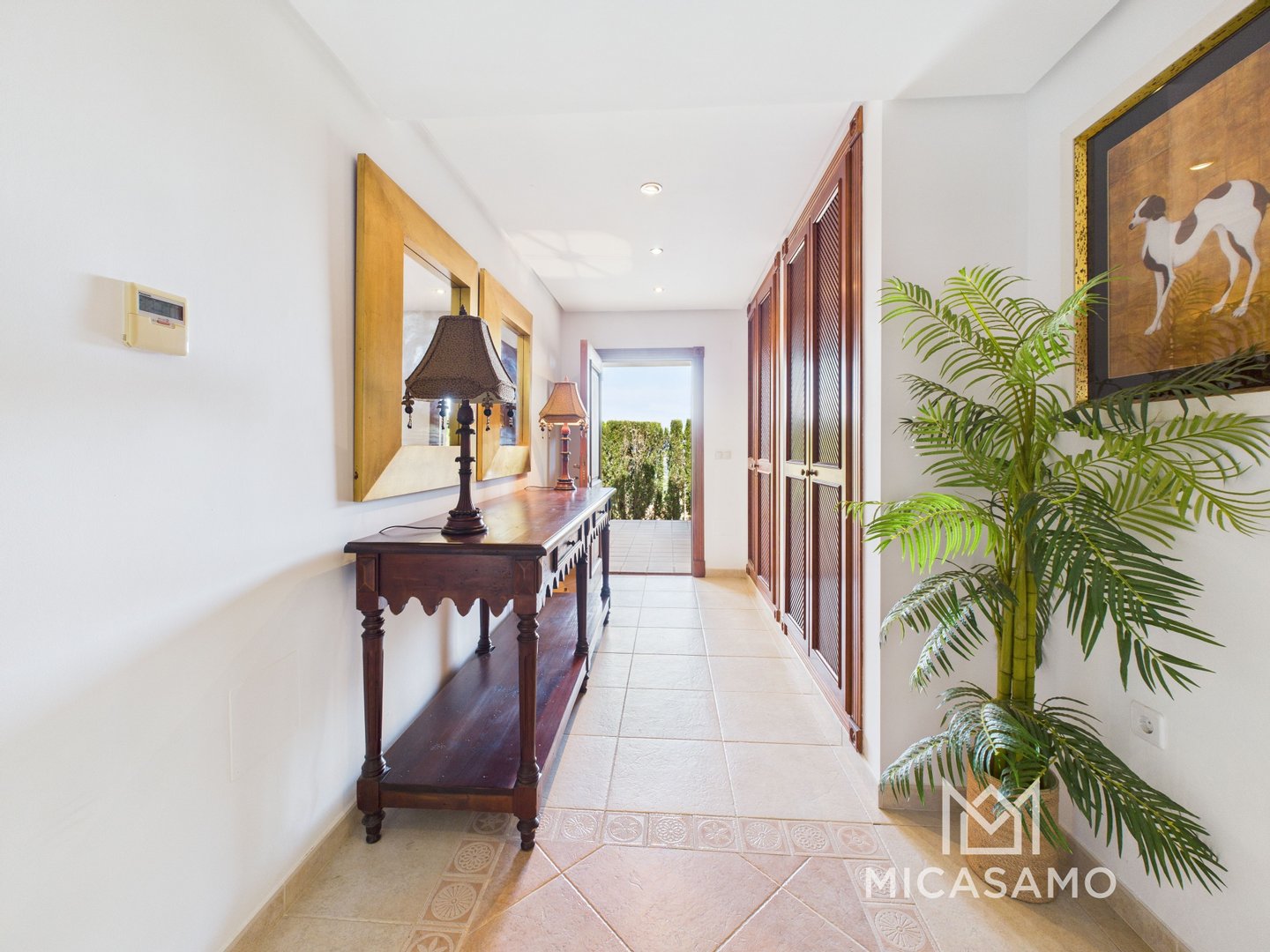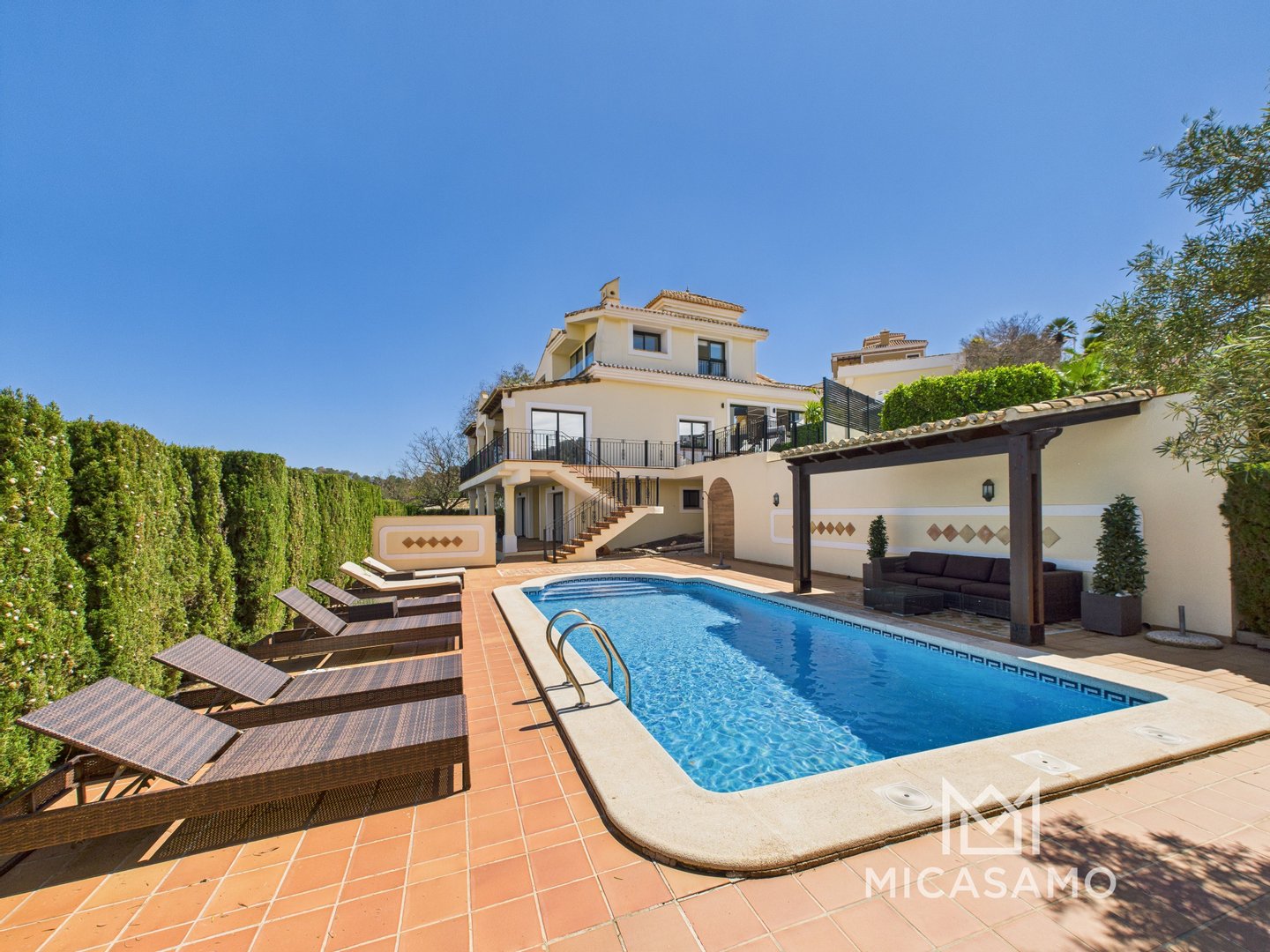 Auf der unteren Ebene befinden sich drei weitere geräumige Schlafzimmer, alle mit Einbauschränken und ein Hauswirtschaftsraum. Von dieser Ebene aus haben Sie direkten Zugang zu einer überdachten Terrasse und dem Poolbereich.