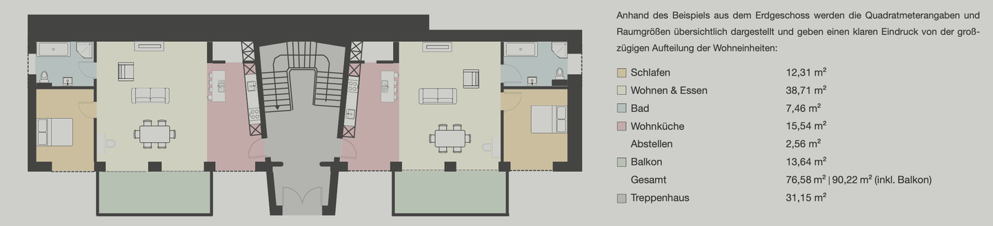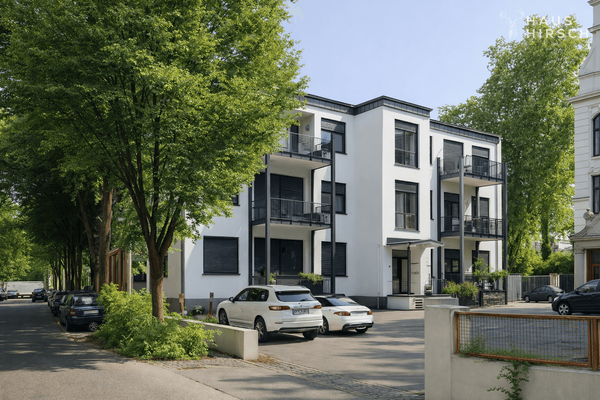 Heute umfasst das Objekt sechs hochwertig ausgestattete Wohneinheiten mit einer Gesamtwohnfläche von ca. 511 m² sowie eine zusätzliche Gewerbeeinheit (Büro) im Souterrain mit ca. 40 m². Alle Wohnungen verfügen über moderne, klar strukturierte Grundrisse mit jeweils ca. 86 m² Wohnfläche und einem großzügigen Balkon. Ergänzt wird das Raumangebot durch separate, den Wohnungen zugeordnete Kellerbereiche.