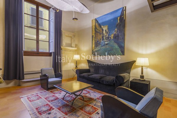 In the authentic heart of Florence's Oltrarno district, within a prestigious historic palazzo and on the piano nobile (the main noble floor), lies this charming representative apartment that perfectly preserves the timeless character of the great