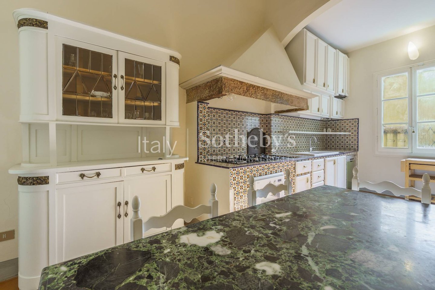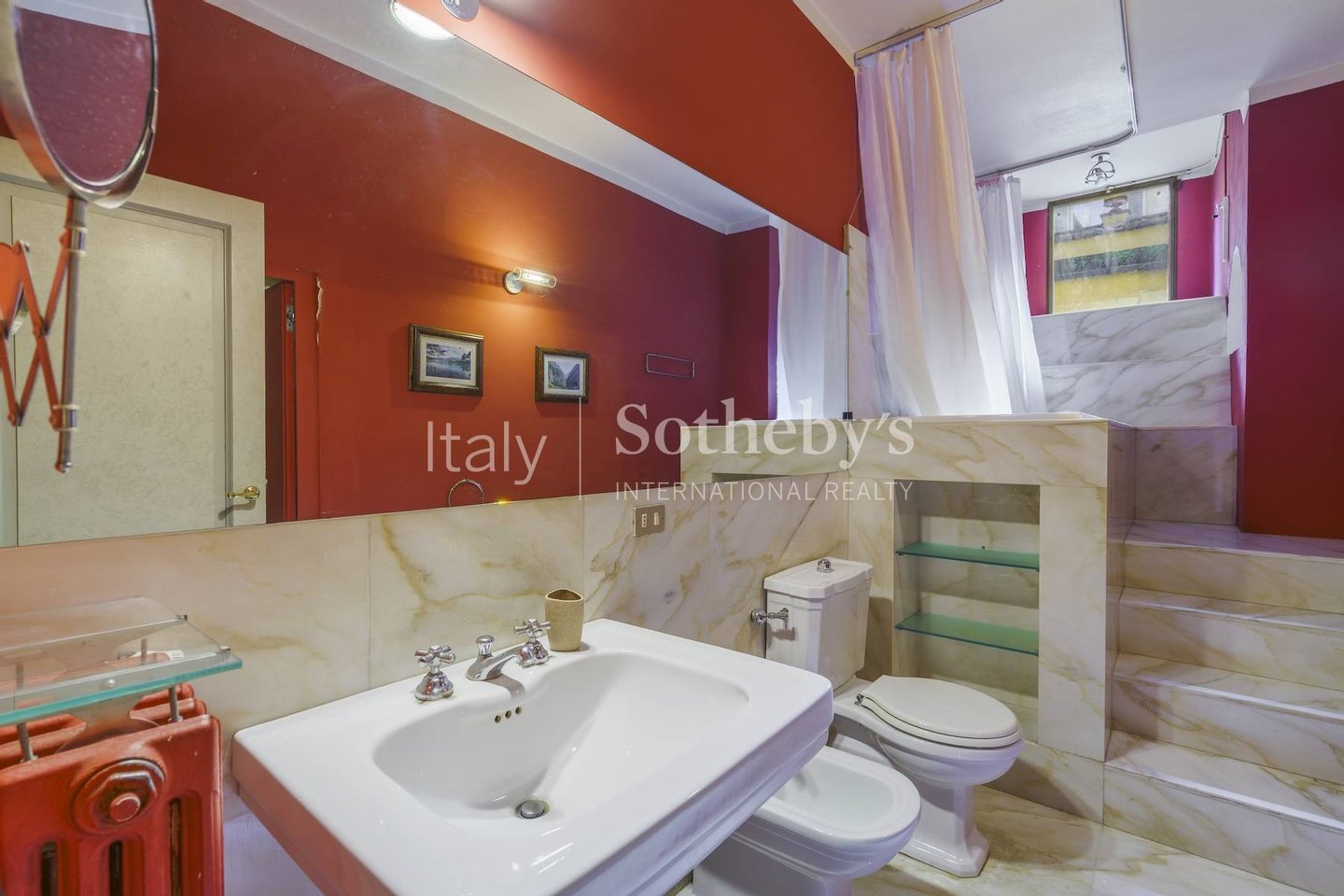 The apartment, partially furnished and fully air-conditioned, stands out for its harmonious blend of historic elegance and contemporary comfort. The formal entrance leads into a spacious living room enhanced by an antique fireplace, a highly atmospheric space opening onto charming views of a carefully maintained internal courtyard, ensuring both light and tranquility.