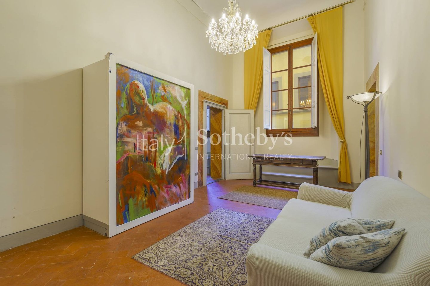 In the authentic heart of Florence's Oltrarno district, within a prestigious historic palazzo and on the piano nobile (the main noble floor), lies this charming representative apartment that perfectly preserves the timeless character of the great Tuscan r