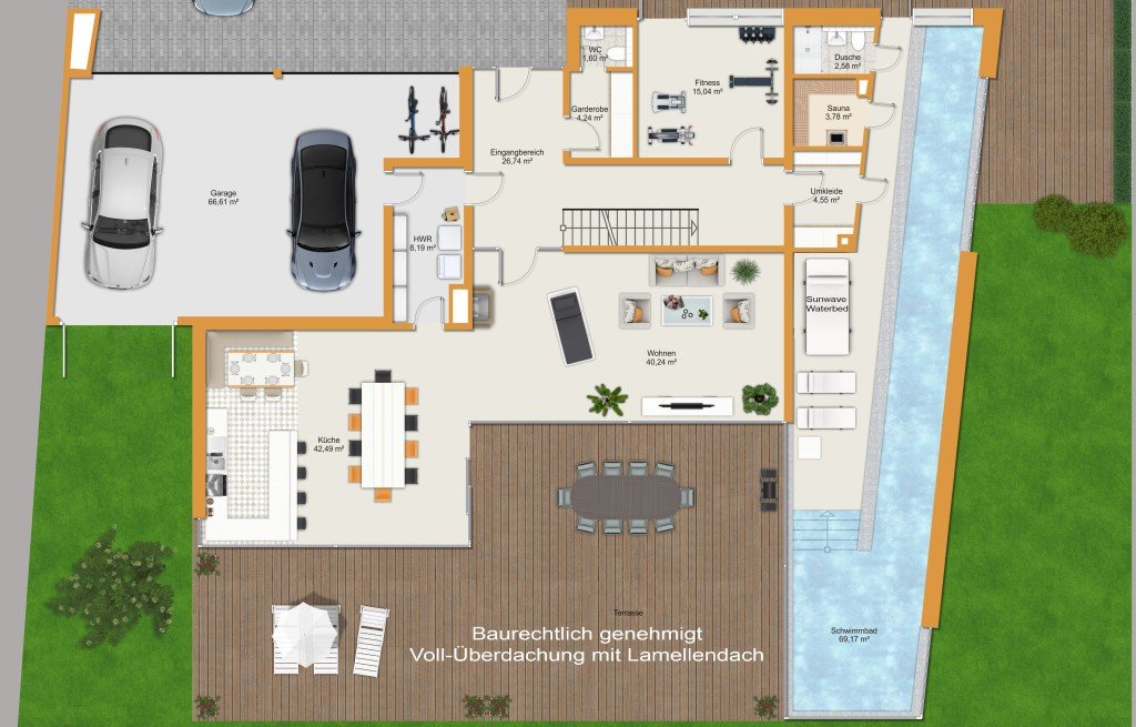 bietet eine seltene Kombination aus Ruhe und Aktivität mit nicht einsehbarer Südwest-Terrasse, klimatisiertem Fitness-Cube sowie einer ca. 200 m² großen Kids-Play-Arena mit LED-Flutlicht.