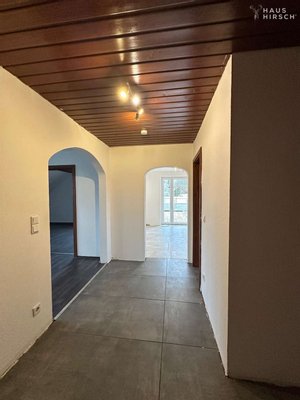 Das im Jahr 1982 erbaute Wohnhaus verfügt über etwa 280 m² Wohn- und Nutzfläche und ist derzeit in zwei Wohneinheiten mit separaten Eingängen aufgeteilt. Die Erdgeschosswohnung mit ca. 130 m² bietet einen großzügigen Wohnbereich mit Fußbodenheizung, großer Fensterfront und offenem Kamin. Von hier aus gelangt man direkt auf die Terrasse und in den Garten. Ergänzt wird die Wohnung durch eine Küche mit Hauswirtschaftsraum, zwei Schlafzimmer, ein Badezimmer mit Dusche und Badewanne sowie ein Gäste-WC und einen Abstellraum.