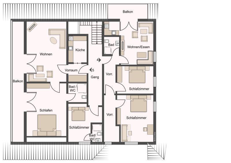 Das Wohnungsangebot umfasst zwei Einheiten mit jeweils ca. 45 m² Wohnfläche, eine weitere Wohnung mit ca. 30 m² sowie eine großzügig geschnittene Einheit mit rund 60 m². Diese Appartements verfügen jeweils über ein Schlafzimmer und ein Badezimmer und bieten durch ihre durchdachte Raumaufteilung ein angenehmes Wohnambiente. Eine zusätzliche Wohnung mit ca. 70 m² Wohnfläche überzeugt mit zwei Schlafzimmern und zwei Bädern und eignet sich ideal für Familien oder Gäste mit erhöhtem Platzbedarf. Im Obergeschoss befindet sich zudem eine weitere, ca. 30 m² große Wohnung mit Balkon, die derzeit familiär genutzt wird. Ergänzend stehen im Dachgeschoss ein separates Schlafzimmer mit Schrankraum sowie ein Badezimmer inklusive WC zur Verfügung, wodurch zusätzliche flexible Nutzungsmöglichkeiten gegeben sind.