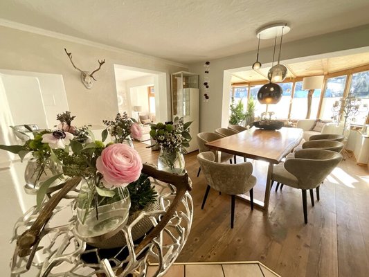 Darüber hinaus öffnen sich im Ober- und Dachgeschoss fünf charmant eingerichtete Ferienwohnungen, jede einzelne mit ganz eigenem Charakter. Liebevolle Details, warme Materialien und der Blick auf die beeindruckende Bergwelt schaffen Rückzugsorte, an denen man ankommt und bleiben möchte. Balkone und Sonnenterrassen schenken Weitblick, Ruhe und dieses ganz besondere Gefühl von Freiheit.