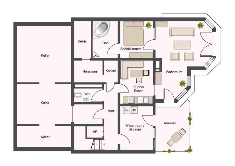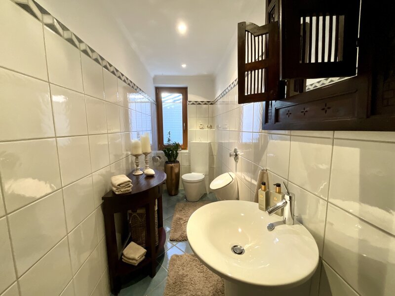 Im Untergeschoss warten zusätzliche Räume voller Möglichkeiten – Diverse Stauräume, Technik und eine weitere Wohnung mit Terrasse, die darauf wartet, wieder zum Strahlen gebracht zu werden. Auch hier schlummert Potential für neue Ideen.
