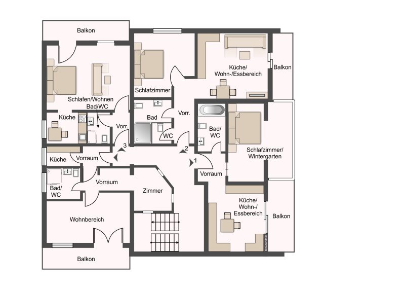 Das Wohnungsangebot umfasst zwei Einheiten mit jeweils ca. 45 m² Wohnfläche, eine weitere Wohnung mit ca. 30 m² sowie eine großzügig geschnittene Einheit mit rund 60 m². Diese Appartements verfügen jeweils über ein Schlafzimmer und ein Badezimmer und bieten durch ihre durchdachte Raumaufteilung ein angenehmes Wohnambiente. Eine zusätzliche Wohnung mit ca. 70 m² Wohnfläche überzeugt mit zwei Schlafzimmern und zwei Bädern und eignet sich ideal für Familien oder Gäste mit erhöhtem Platzbedarf. Im Obergeschoss befindet sich zudem eine weitere, ca. 30 m² große Wohnung mit Balkon, die derzeit familiär genutzt wird. Ergänzend stehen im Dachgeschoss ein separates Schlafzimmer mit Schrankraum sowie ein Badezimmer inklusive WC zur Verfügung, wodurch zusätzliche flexible Nutzungsmöglichkeiten gegeben sind.