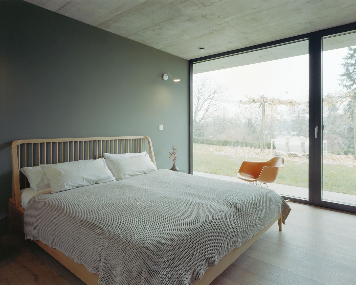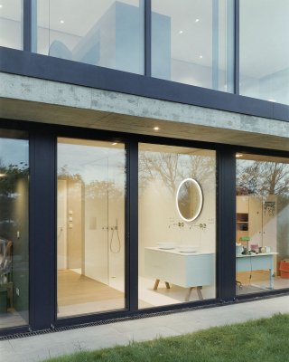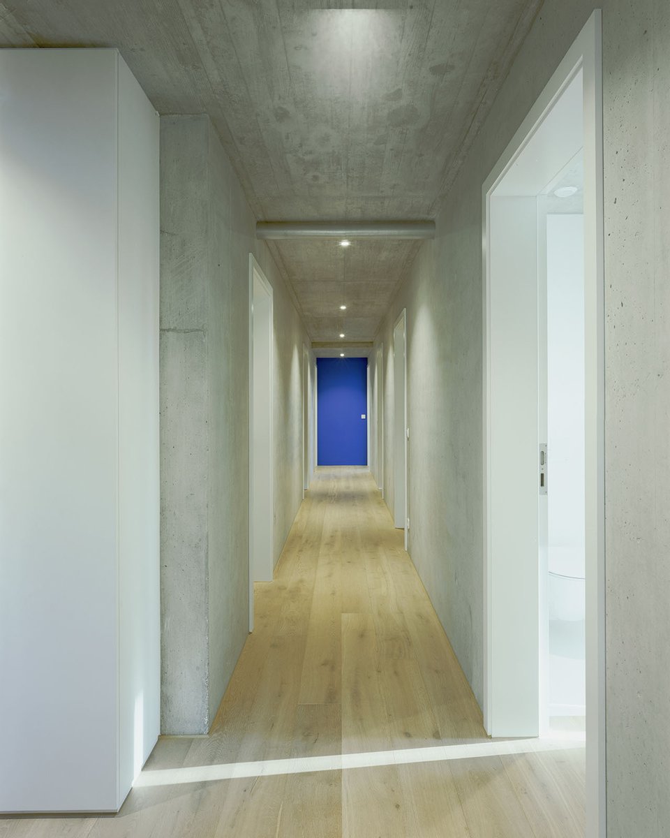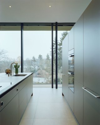 Im Inneren setzt sich die kompromisslose Ästhetik fort. Großzügige Raumhöhen und bodentiefe Verglasungen schaffen eine helle, einladende Atmosphäre. Die Architektur folgt einem klaren Konzept: Während sich das Haus zum Garten und zur Aussicht hin öffnet, garantiert die bewusst fensterlose Nordseite ein Maximum an Privatsphäre.