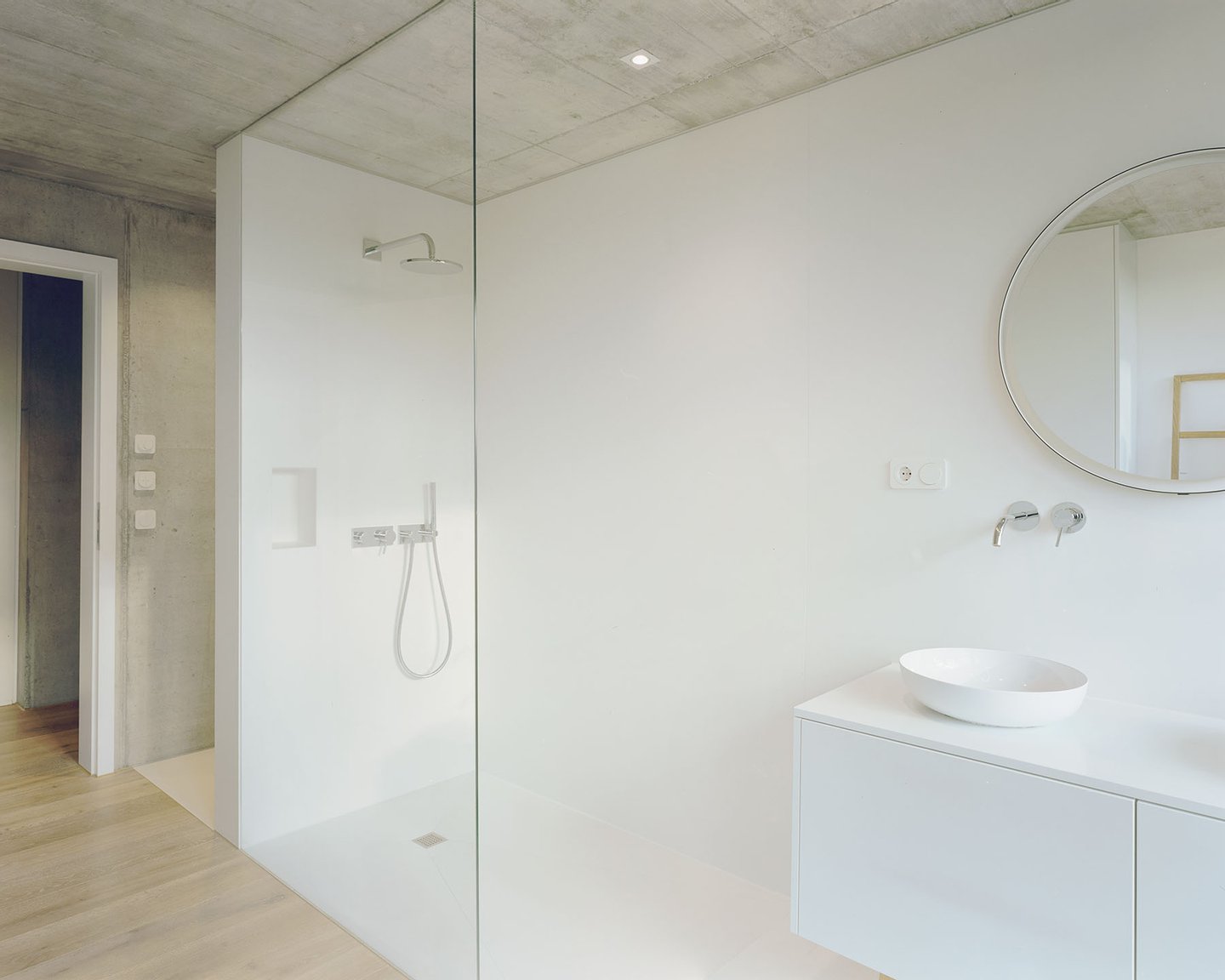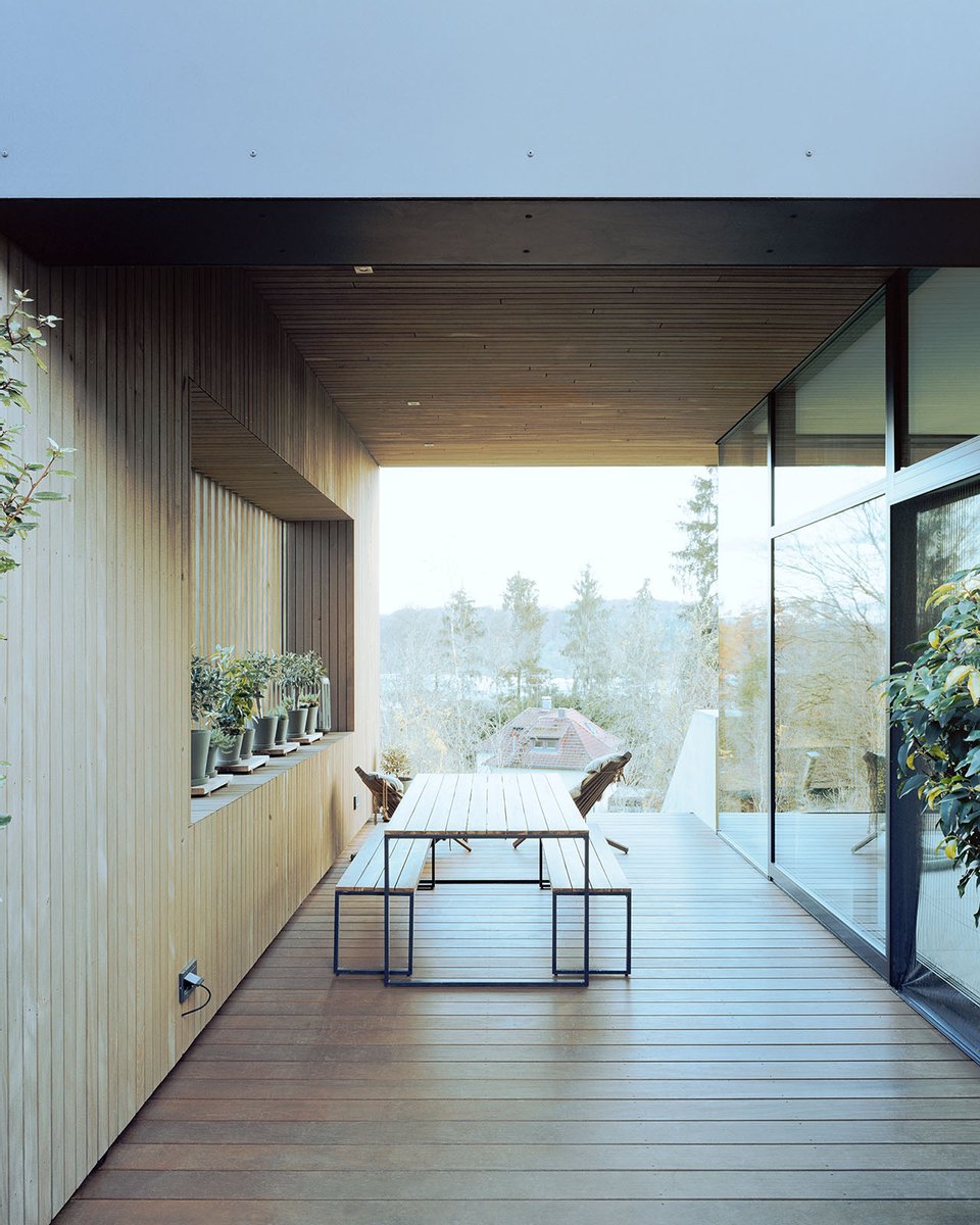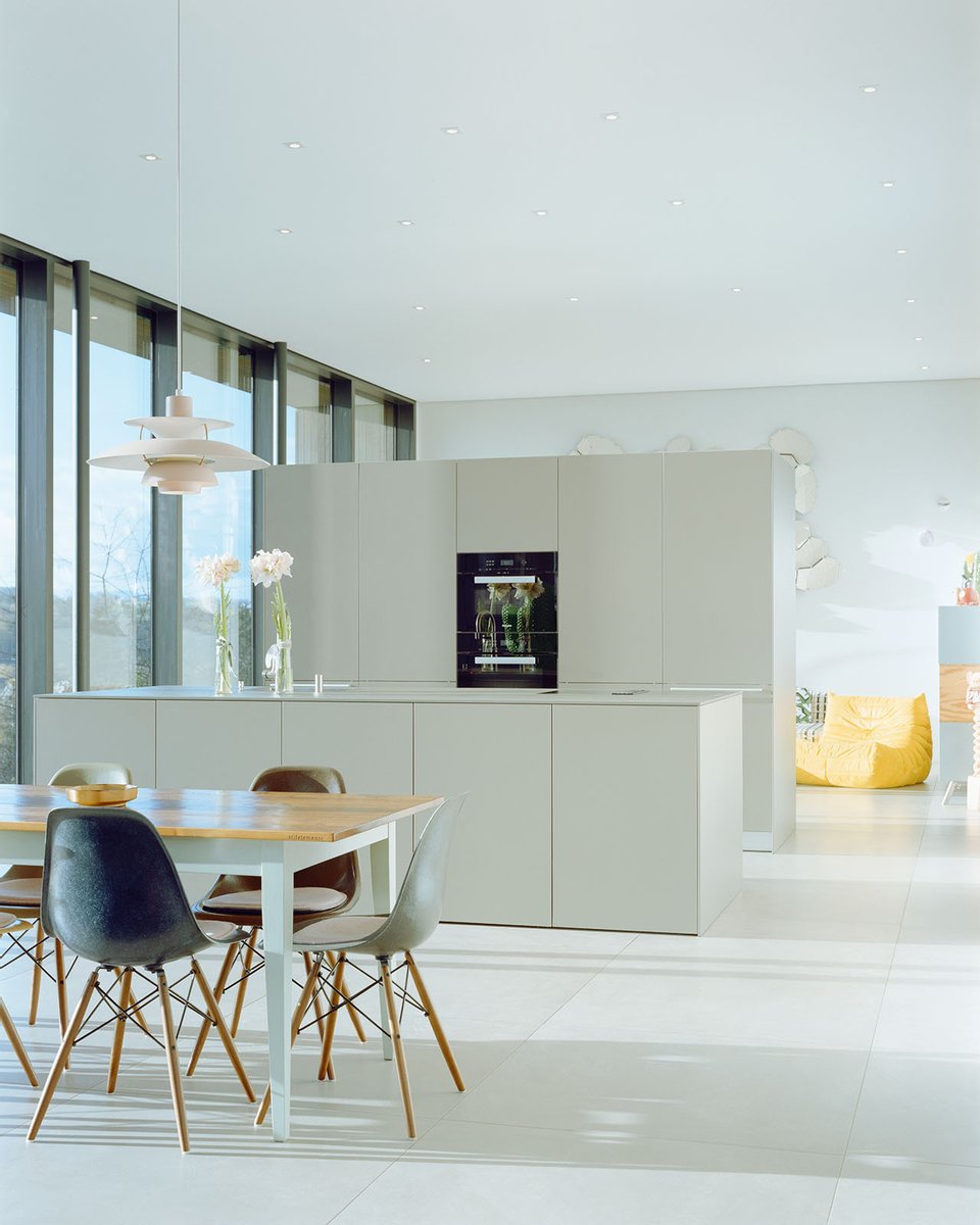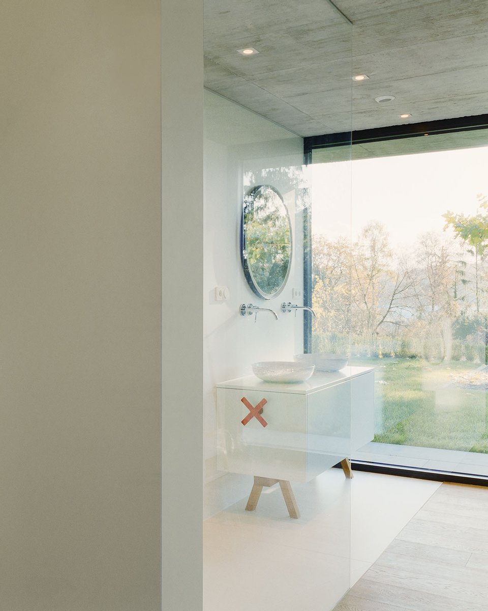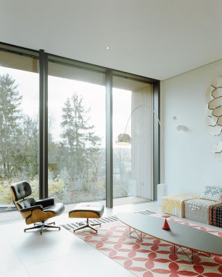 Im Inneren setzt sich die kompromisslose Ästhetik fort. Großzügige Raumhöhen und bodentiefe Verglasungen schaffen eine helle, einladende Atmosphäre. Die Architektur folgt einem klaren Konzept: Während sich das Haus zum Garten und zur Aussicht hin öffnet, garantiert die bewusst fensterlose Nordseite ein Maximum an Privatsphäre.