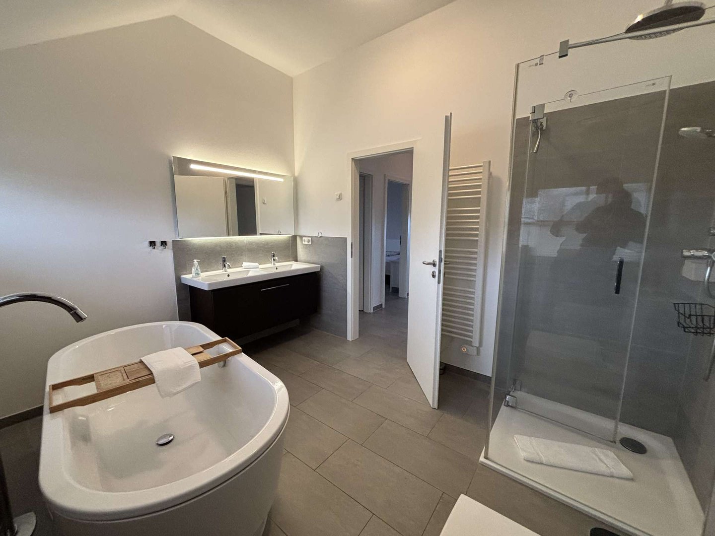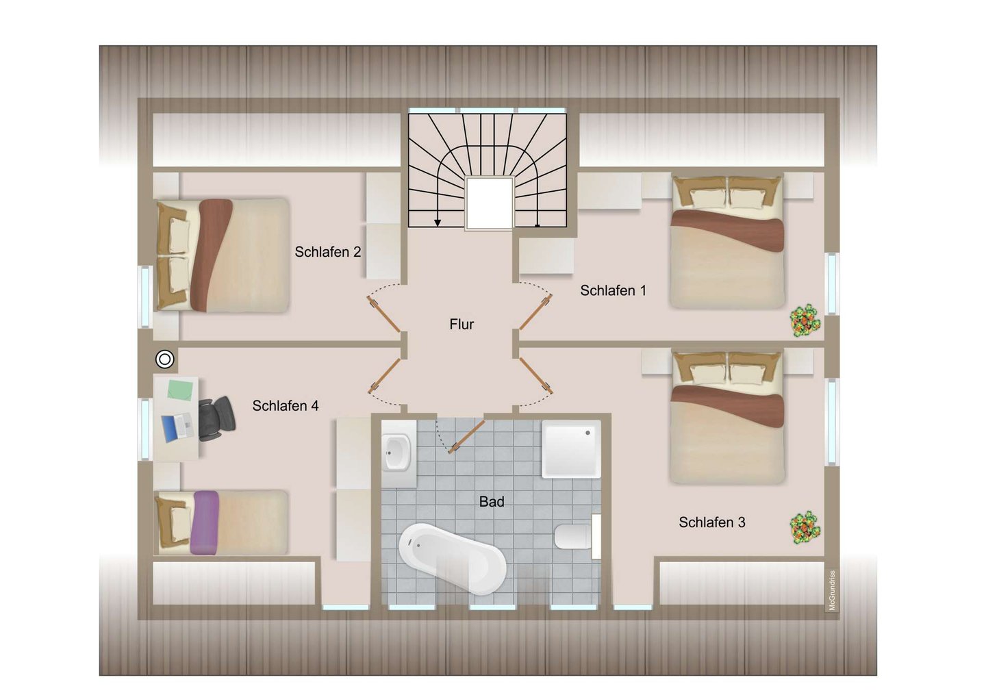 Im Dachgeschoss erwarten Sie vier stilvolle Schlafzimmer und ein voll ausgestattetes Bad mit Badewanne und Dusche – perfekt, um Gästen oder der eigenen Familie ausreichend Privatsphäre zu bieten.