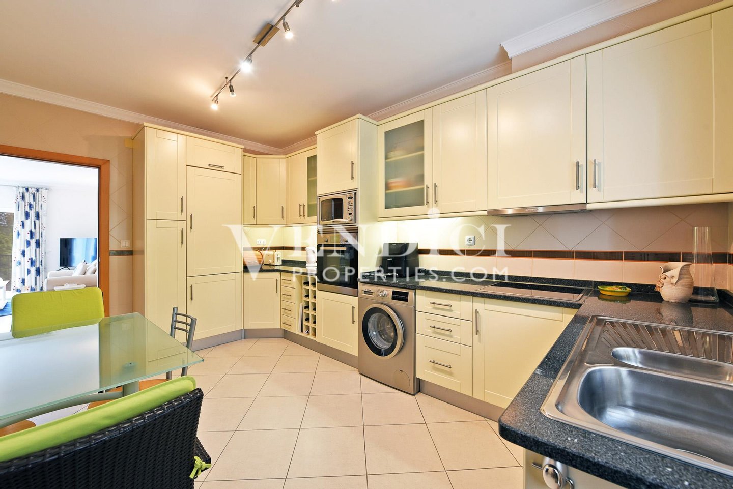 Die Küche ist vollständig ausgestattet und mit Zugang zur Rückterrasse und zum Grillbereich.