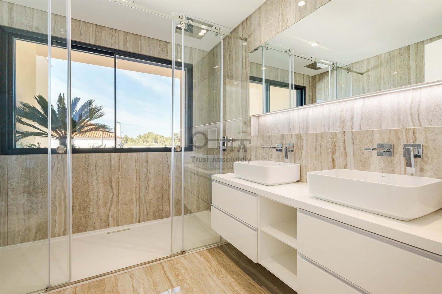Diese Villa überzeugt neben hochwertiger Ausstattung auch durch elektrische Rollläden mit integrierter Hausautomation, LED-Beleuchtung mit Automatisierung, Videosprechanlage, Solarzellen, zentrale Staubsauganlage, Klimaanlage und schnelle Ladestation für Elektrofahrzeuge.