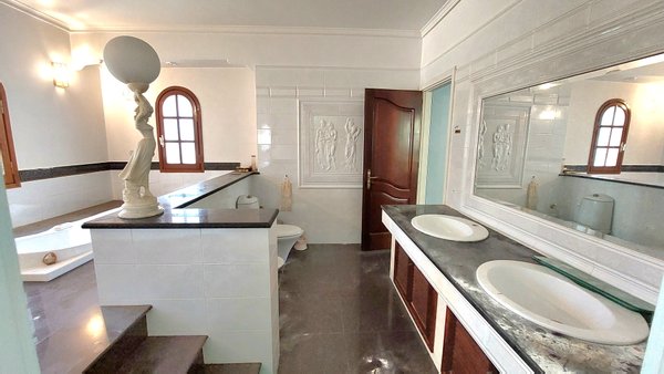 Ein eigenes Marmorbad mit Jacuzzi und Doppelwaschbecken
