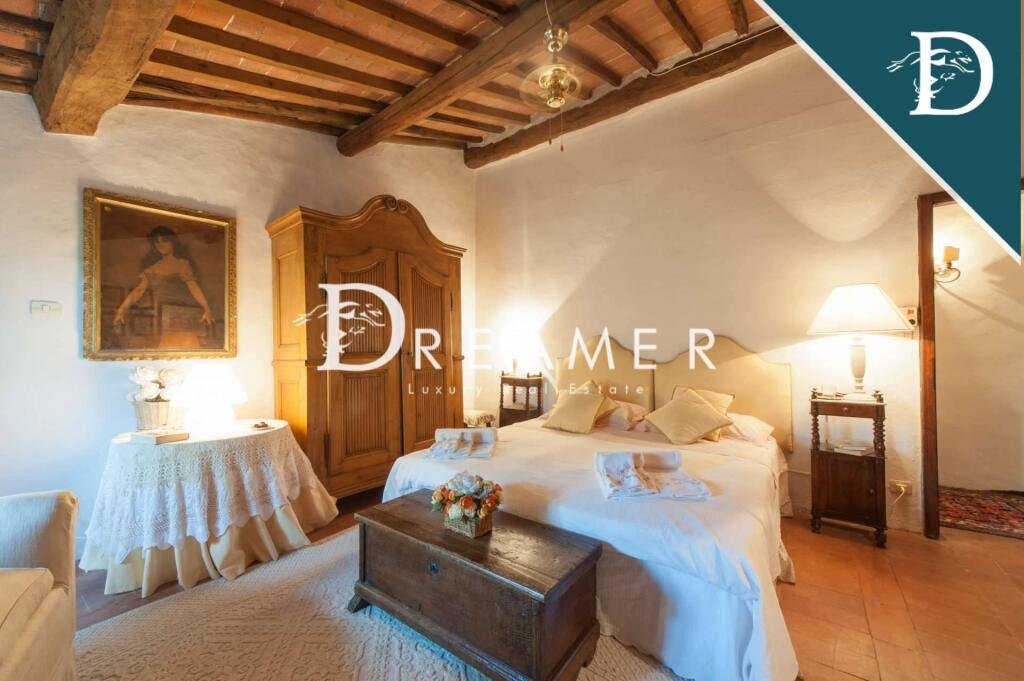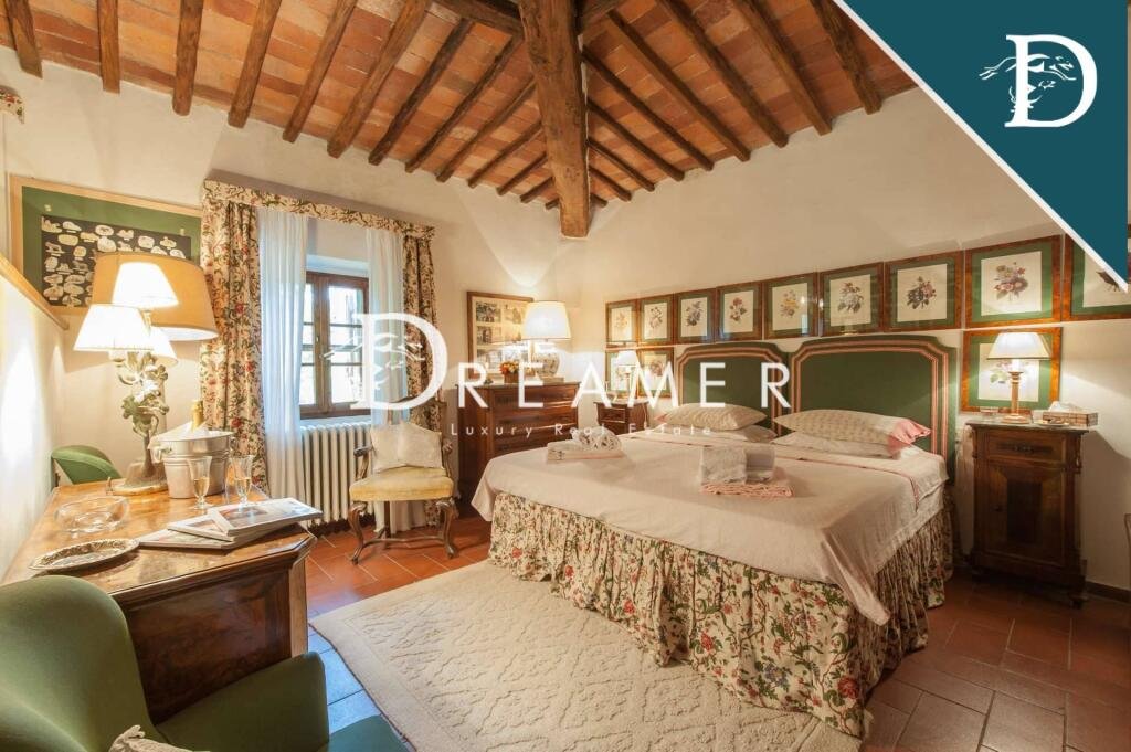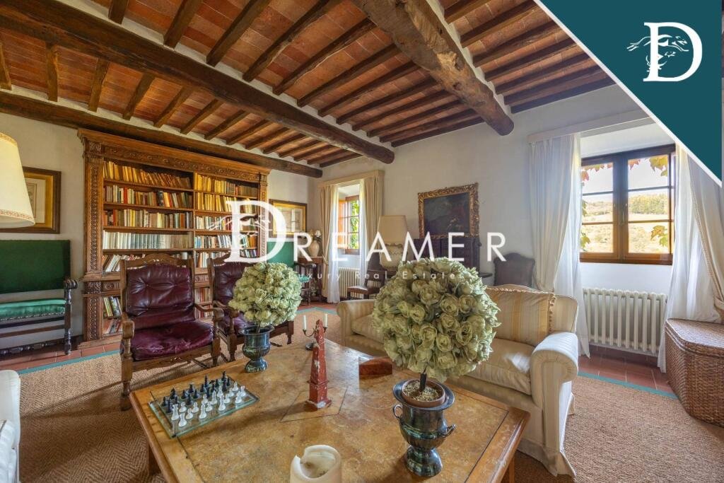 Elegant estate with swimming pool and tennis court for sale in Castellina in Chianti, nestled in the hills of Chianti Senese. The property is composed of two units, with a total of 9 bedrooms and 9 bathrooms:
