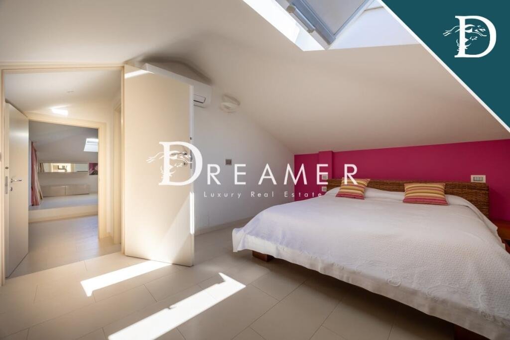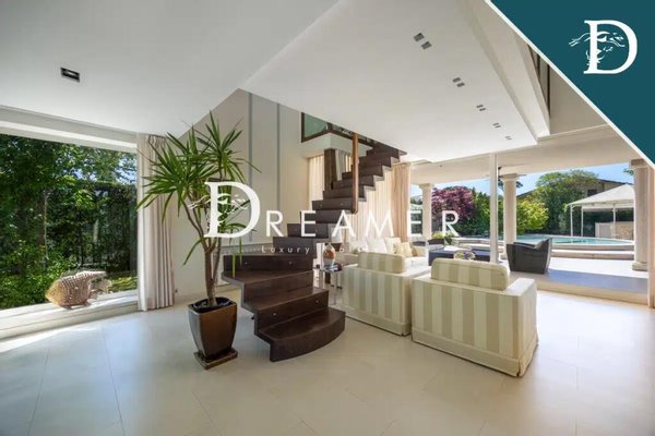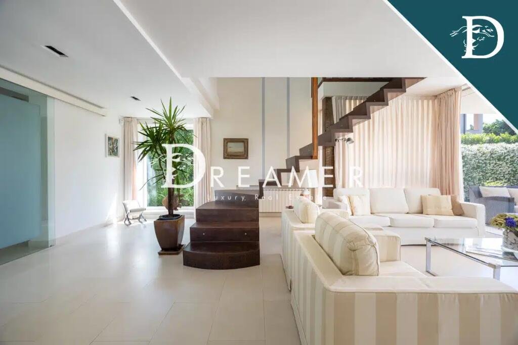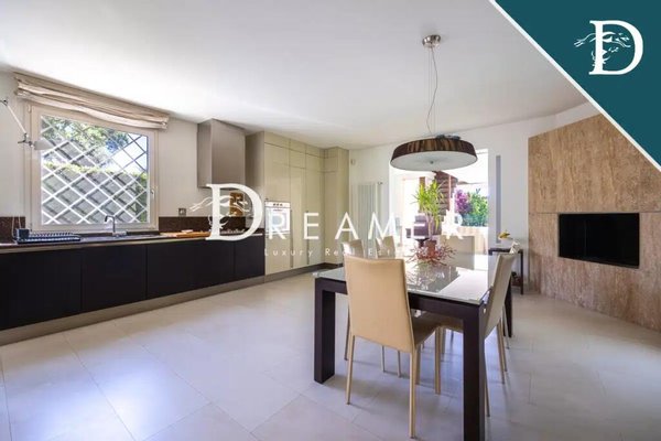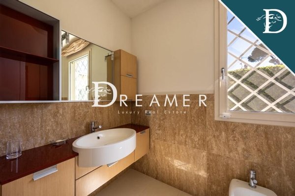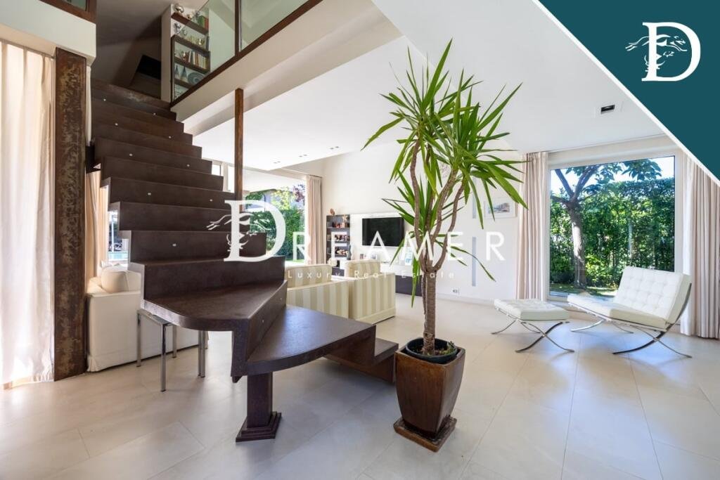 An elegant marble staircase leads to the first floor, where the sleeping area is developed with 2 large double bedrooms with parquet and ensuite bathroom, one of which with a comfortable and large walk-in closet. Both bedrooms also allow access to a large balcony overlooking the garden. An additional attic area overlooks the main living room and adds versatility as a lounge or relaxation space. The second floor houses 2 more bright bedrooms with bathrooms. This exclusive property for sale is embellished with a stunning contemporary design. Its spacious and bright interiors offer the residence a refined and modern atmosphere.