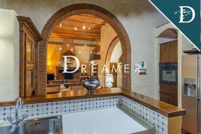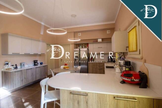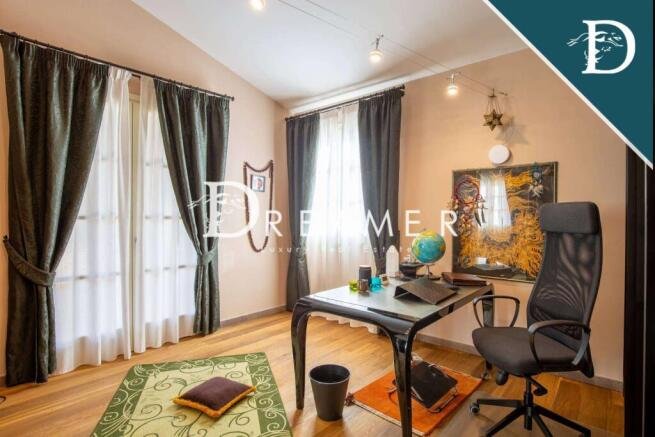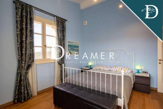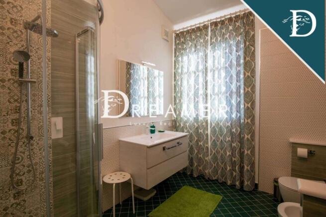 The magnificent central villa is divided into two apartments. The first apartment consists of a charming living room, an eat-in kitchen, and four bedrooms with bathrooms. The second apartment has a bright living room, an eat-in kitchen with a large table, a bedroom, and a bathroom.