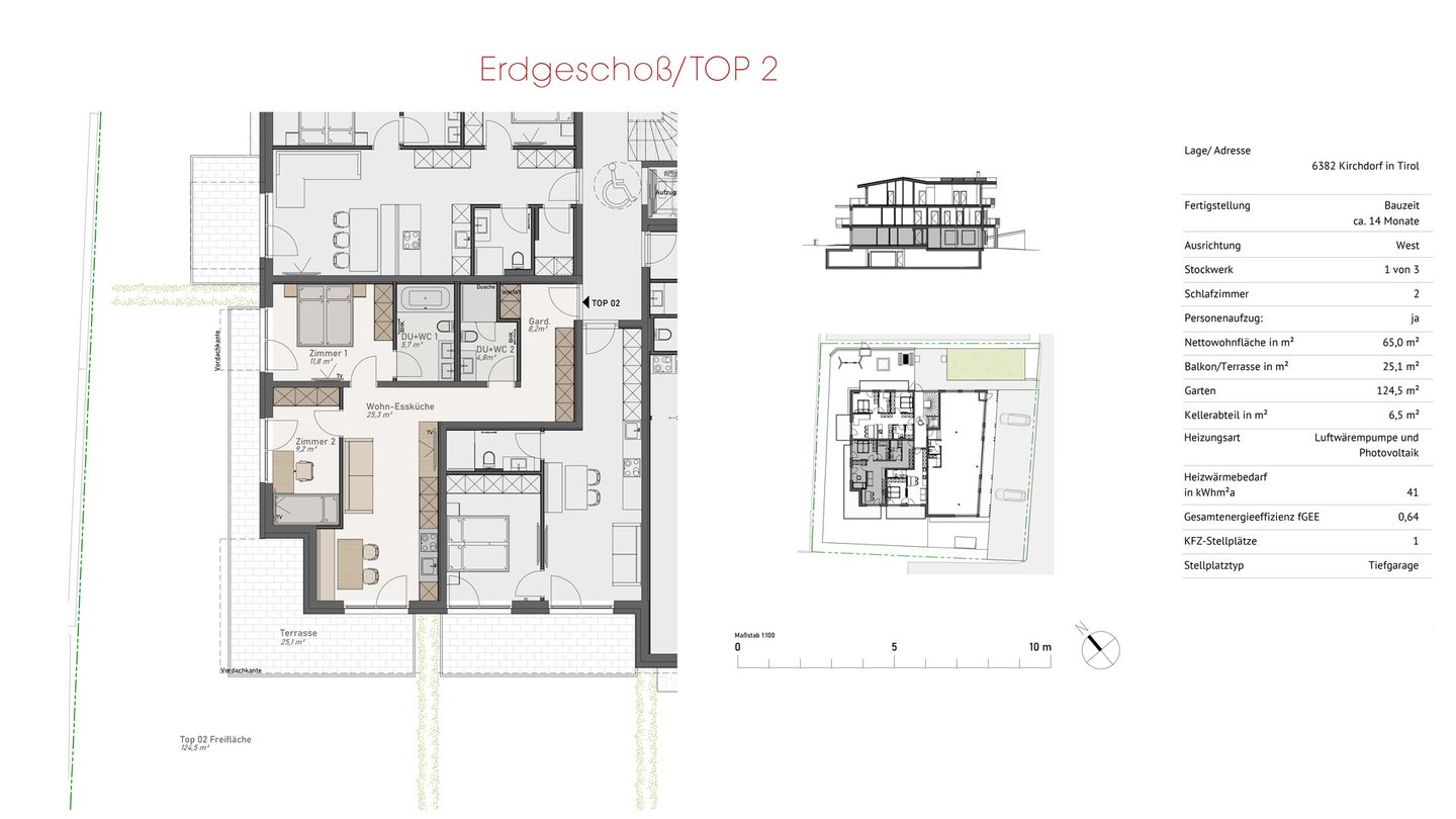 Über die großzügige, hauseigene Tiefgarage gelangen Wohnungseigentümer mittels Lift bequem in alle Etagen. Modernen Anforderungen entsprechend, bieten alle Wohneinheiten schwellenfrein Zugang und garantieren hohen Sicherheitsstandard. Die Bausubstanz des Gebäudes sowie die exklusive Grundausstattung der Wohnungen, entsteht in Zusammenarbeit mit heimischen Professionisten. Im Vordergrund der architektonischen Gestaltung steht die Verbindung aus Mensch und Natur, die sich im Materialeinsatz widerspiegelt.
