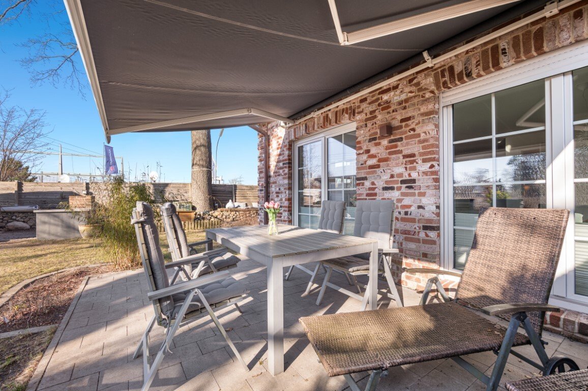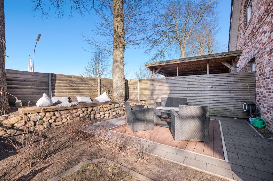 Zwei Terrassen in Süd-Ost- und Süd-West-Ausrichtung ermöglichen es, je nach Tageszeit zwischen sonnigen und schattigen Plätzen zu wählen. Eine elektrische Markise spendet zusätzlich Schatten oder Schutz vor Sommerregen beim gemütlichen Beisammensein. Ein besonderes Highlight sind die mit Douglasie-Holz belegten Friesenwälle, die zusätzliche, außergewöhnliche Sitzmöglichkeiten schaffen und dem Garten eine ganz besondere Note verleihen. Im Sommer lädt eine Außenküche mit einem Außengrill zu gemütlichen Grillabenden ein.