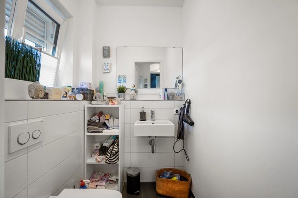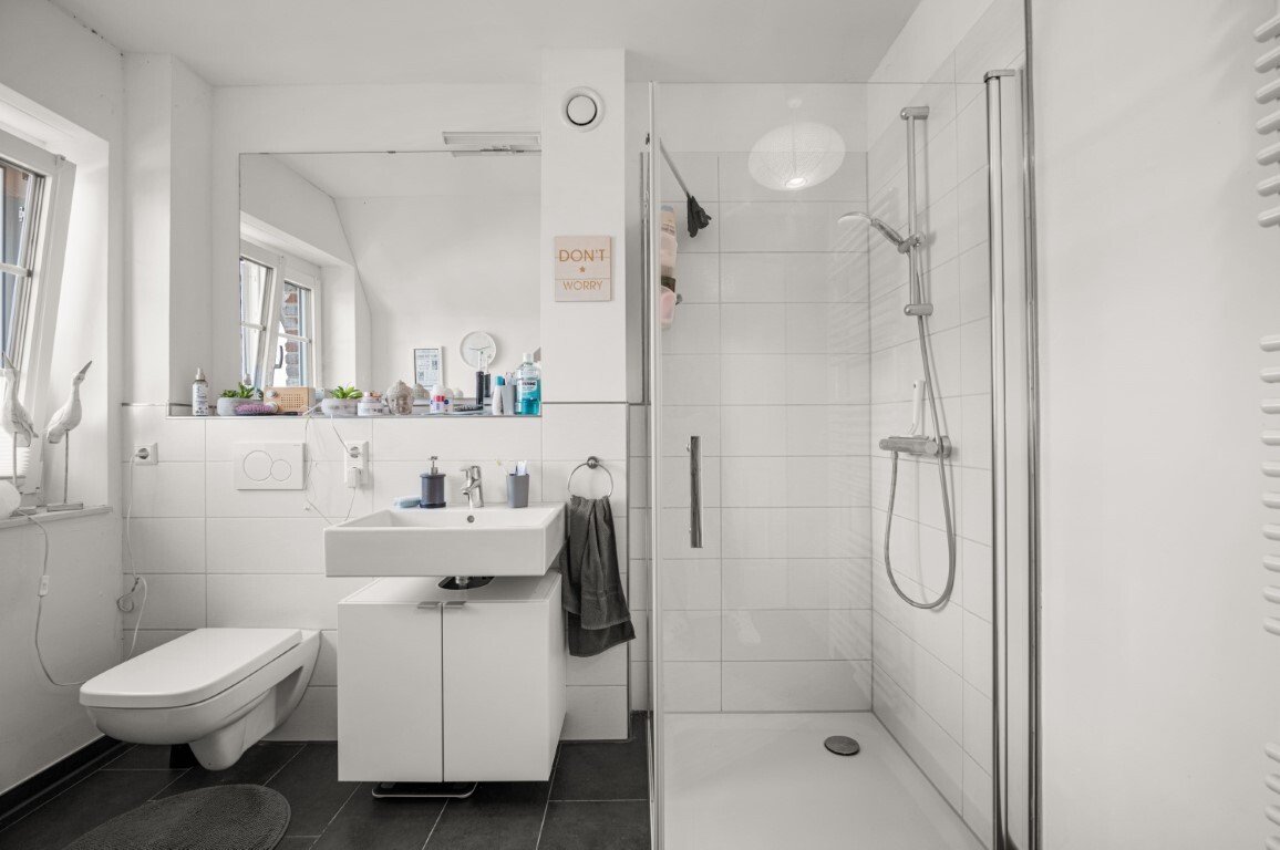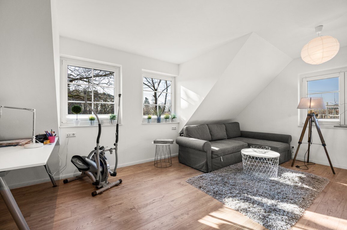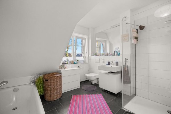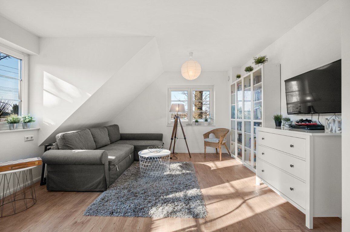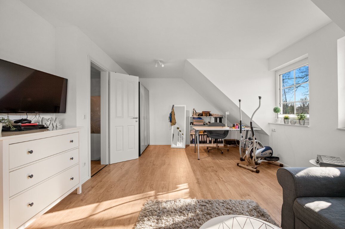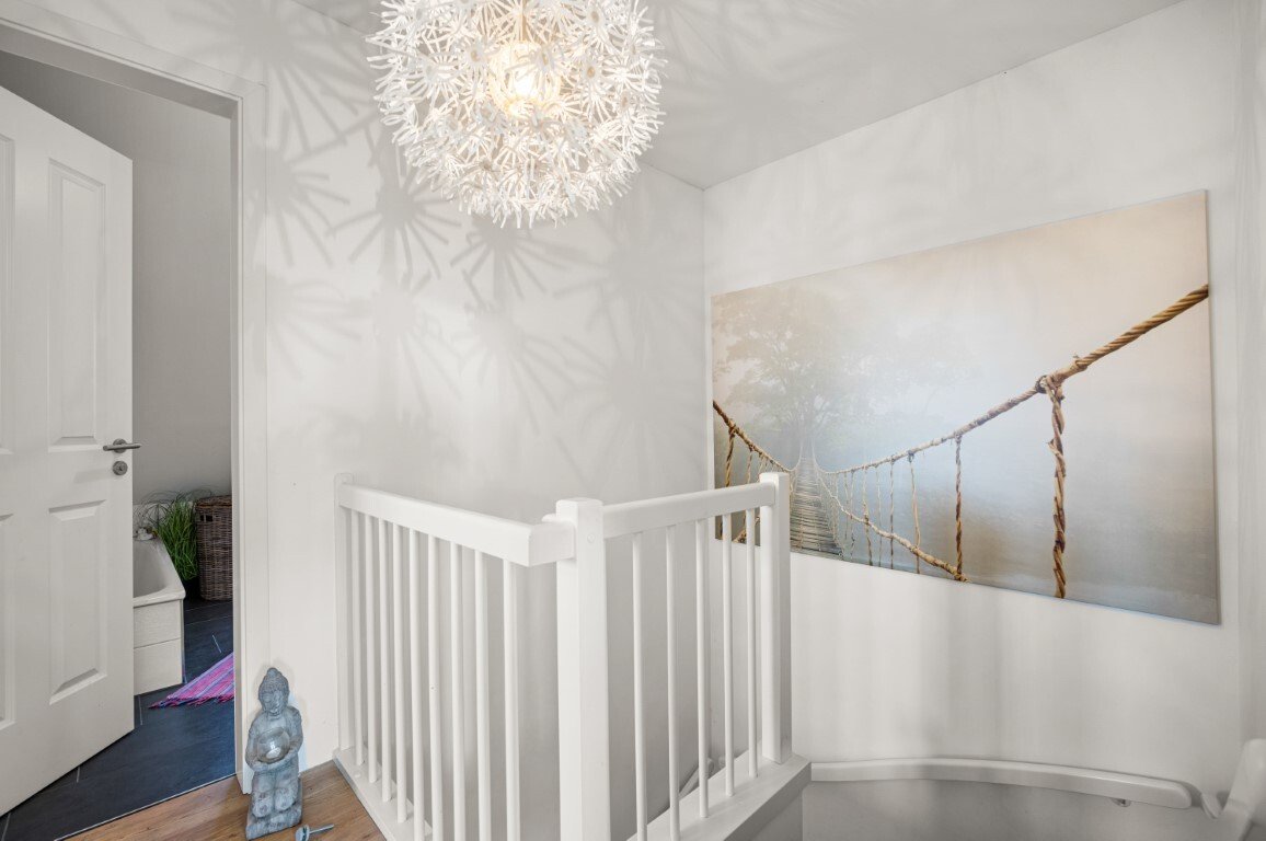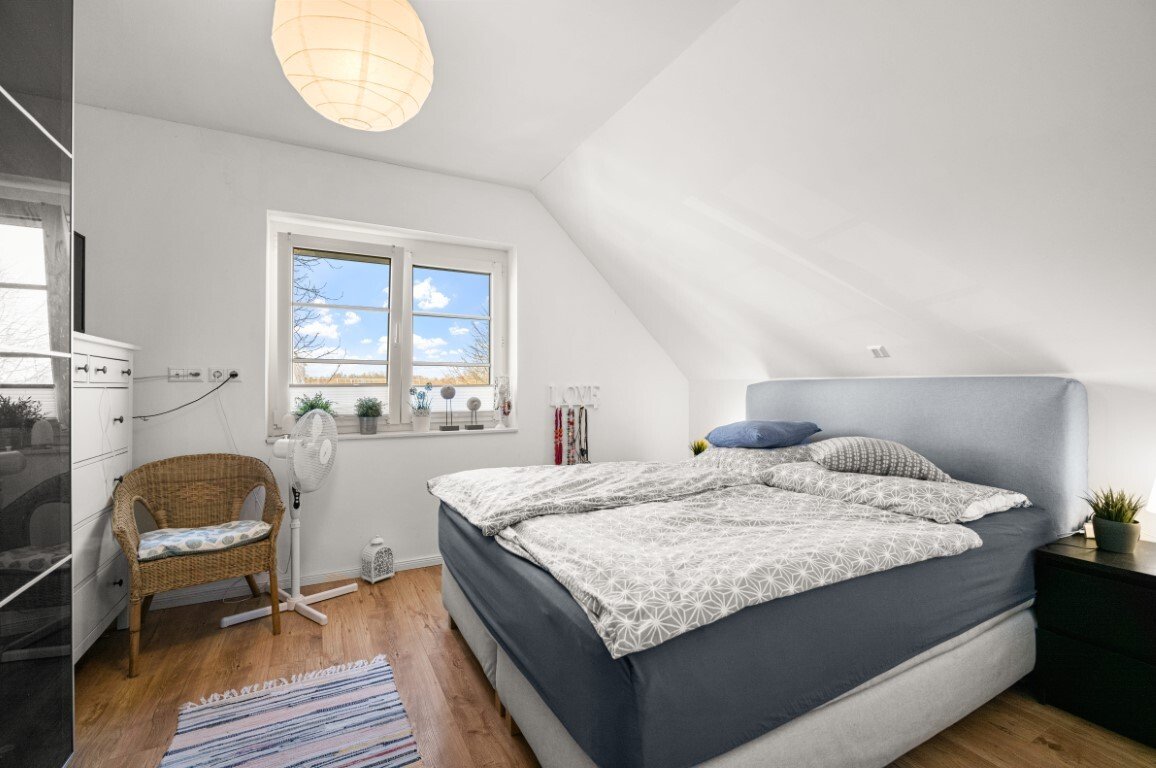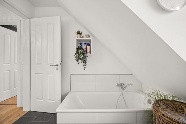 Über eine moderne beleuchtete Treppe gelangen Sie in das Obergeschoss, hier befinden sich zwei geräumige Zimmer und ein modernes Vollbad. Das große Zimmer bietet die Möglichkeit, bei Bedarf zwei separate Räume mit jeweils ca. 12 m² zu schaffen. Von hier genießen Sie im Sommer einen wunderschönen Ausblick auf ein angrenzendes Sonnenblumenfeld. Durch die Gauben sind die Räume besonders hell und freundlich gestaltet und gewinnen zusätzlich an Wohnfläche sowie an gemütlichem Charme. Das stilvolle Vollbad verfügt über eine ebenerdige Dusche, eine Handtuchheizung, einen modernen Waschtisch, eine großzügige Badewanne sowie ein Fenster, das viel Tageslicht hereinlässt.