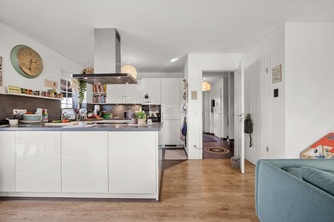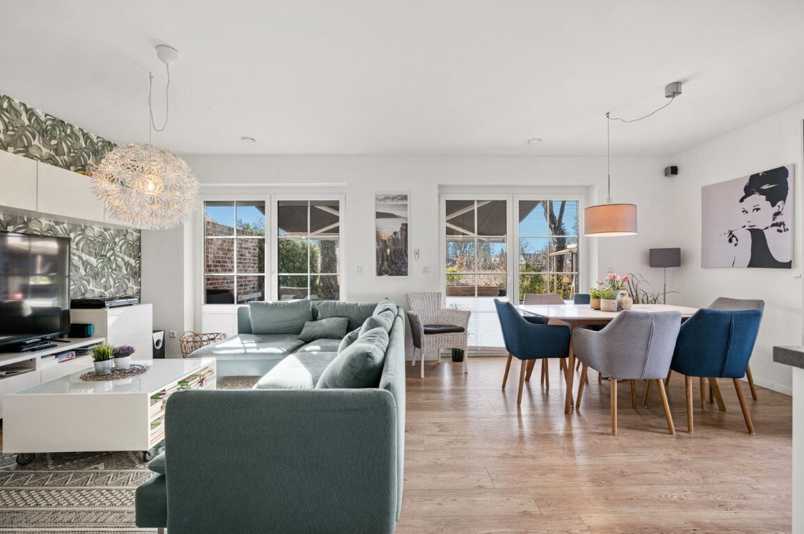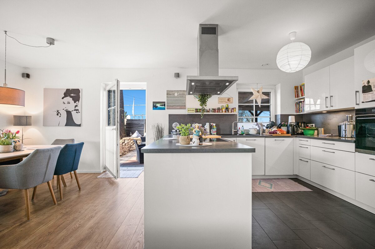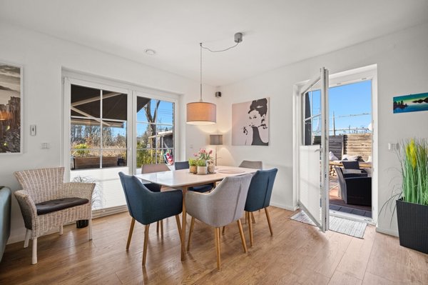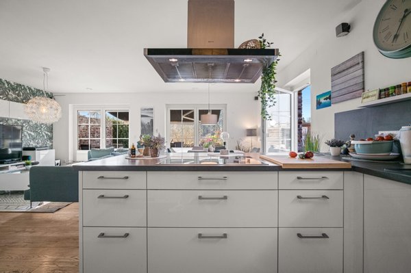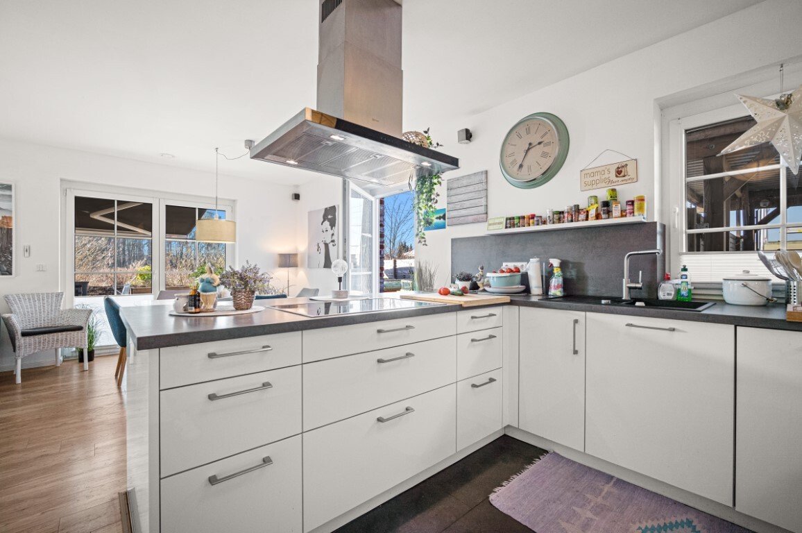 Im Erdgeschoss bildet der großzügig geschnittene Wohn- und Essbereich mit offener Einbauküche das Herzstück des Hauses. Hier verbinden sich Funktionalität und Wohnlichkeit auf ideale Weise. Die hochwertige Küche lässt keine Wünsche offen: Die stilvolle Kochinsel mit Induktionsherd ermöglicht es, auch beim Kochen mit Familie und Gästen in Kontakt zu bleiben, während der Blick ins Grüne für eine besondere Atmosphäre sorgt. Außerdem gibt es Erdgeschoss einen praktischen Hauswirtschaftsraum, eine großzügige Garderobe sowie ein Gäste-WC.