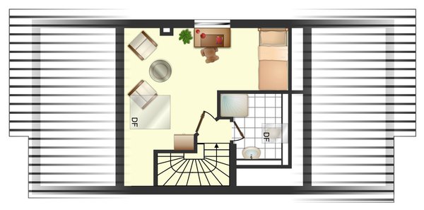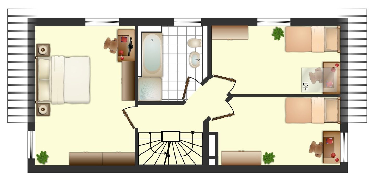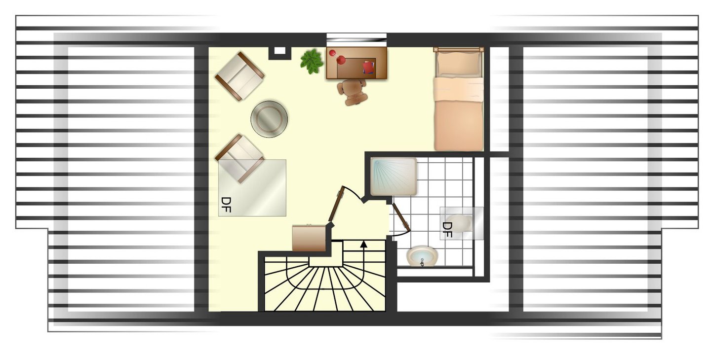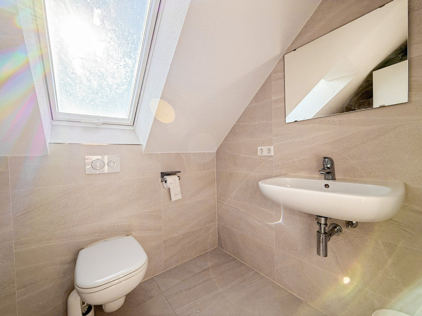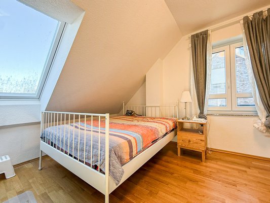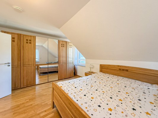 Im Dachgeschoss befinden sich zwei Schlafräume und das Wannen- und Duschbad.
