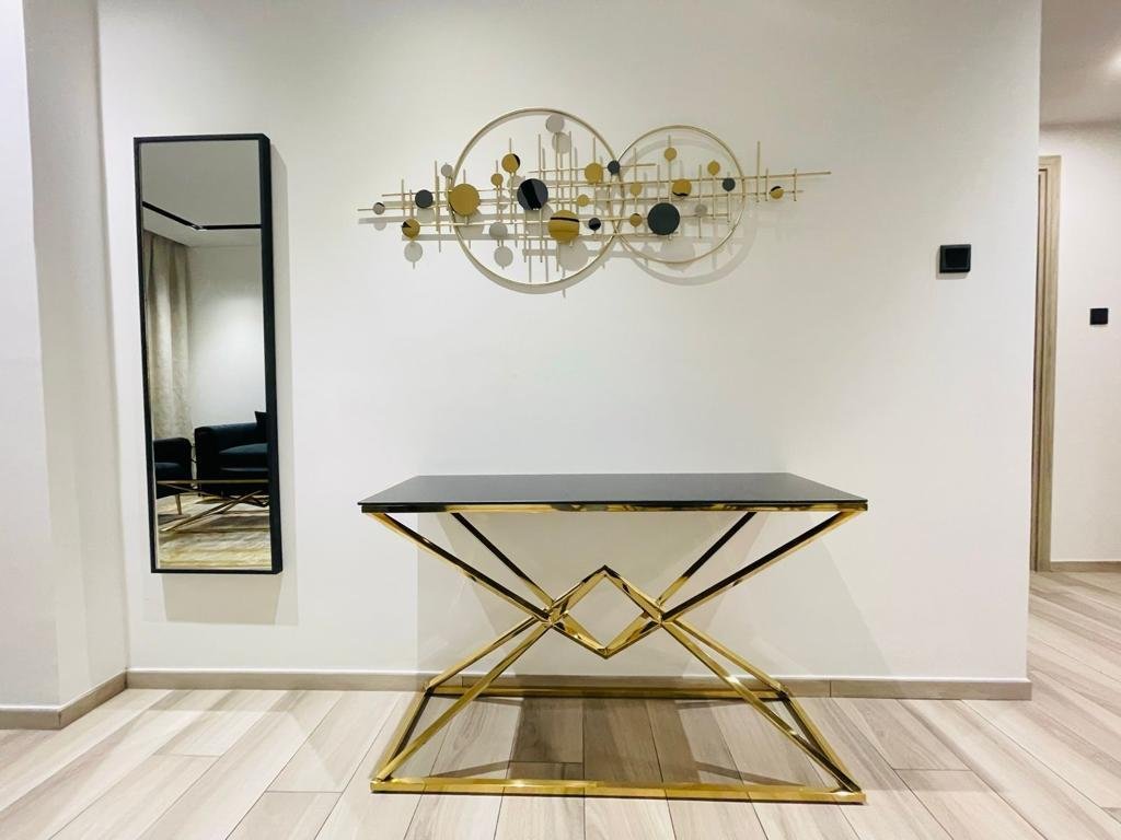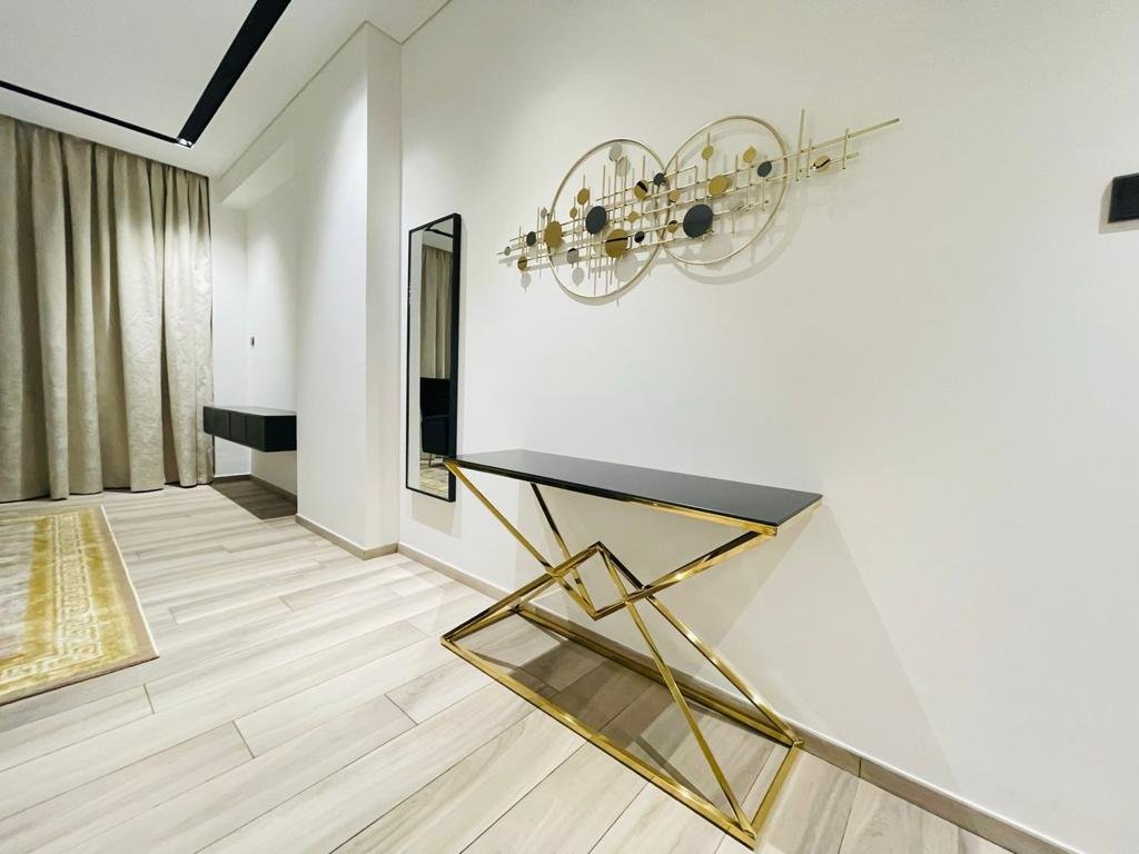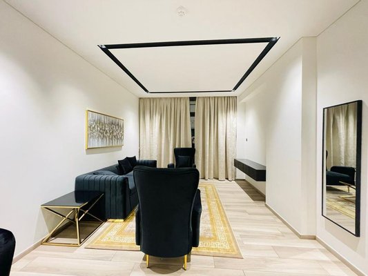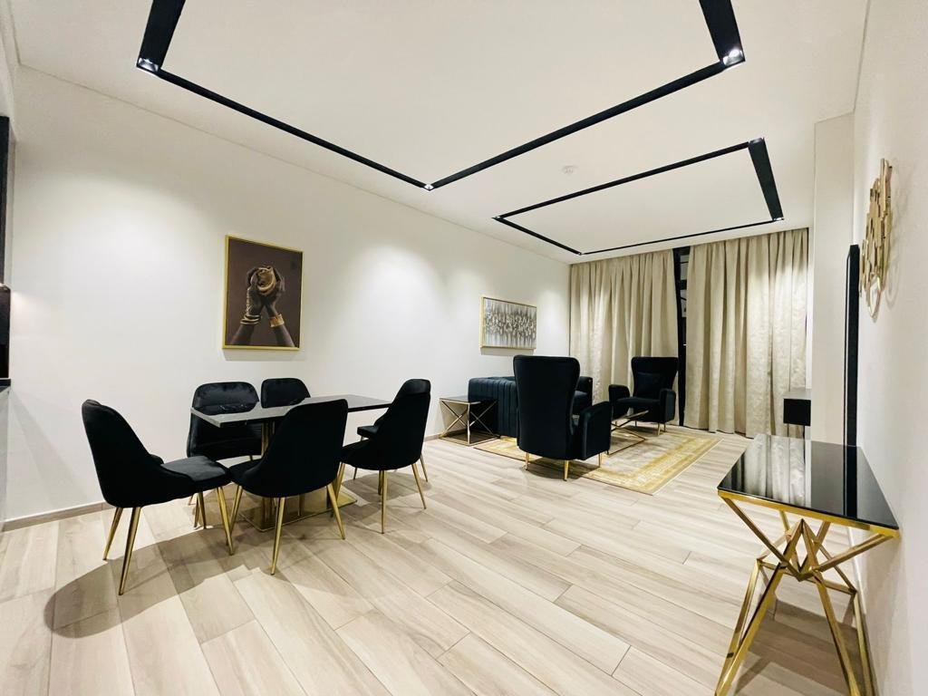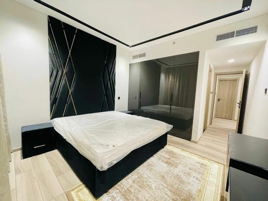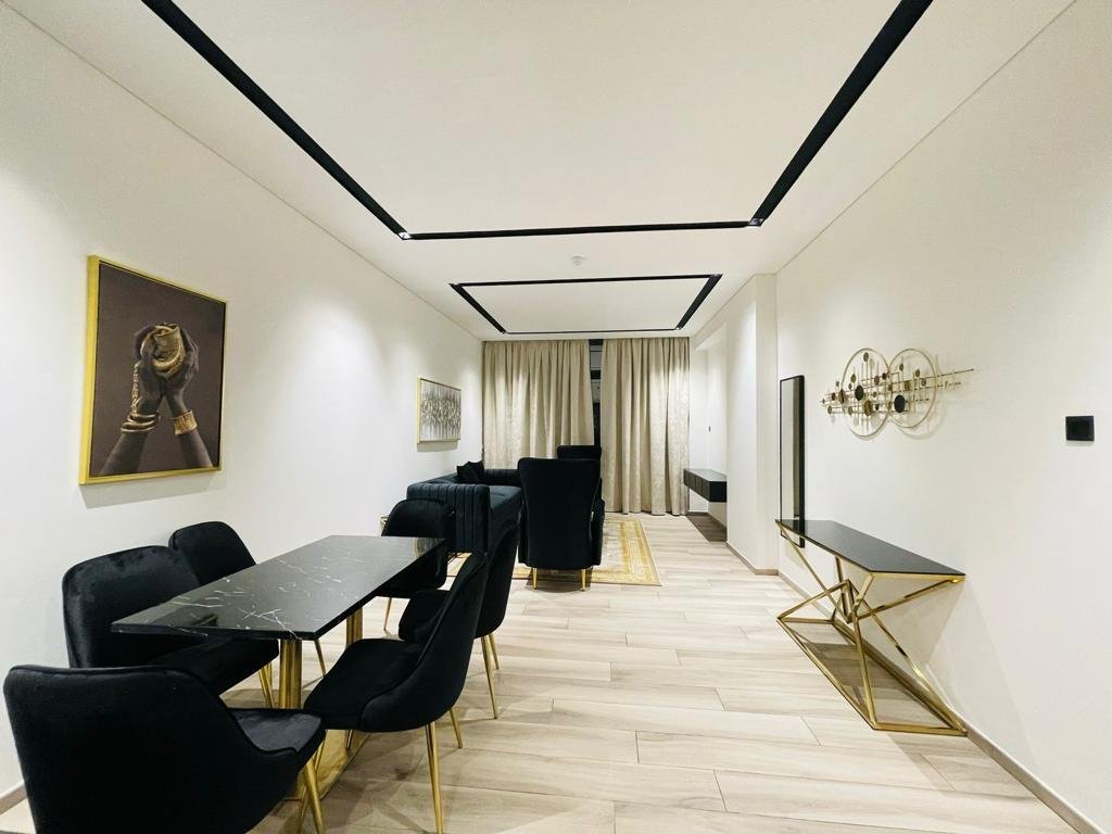 Der Wohnbereich verfügt über große bodenbis-decke Fenster, die einen Blick auf die Innenstadt rahmen, wobei ein L-förmiges Sofa, eine Medienwand und eine Essbereiche eine praktische Unterhaltungszone schaffen. Das Hauptschlafzimmer beinhaltet ein King-Size-Bett, integrierte Kleiderschränke mit Spiegeln und direkten Zugang zum Balkon, wodurch natürliches Licht und Sicht maximiert werden. Ein modernes Badezimmer mit Marmor-Effekt Wandfliesen, begehbarer Dusche und wandhängendem Waschtisch sorgt für ein klares, zeitgenössisches Finish.