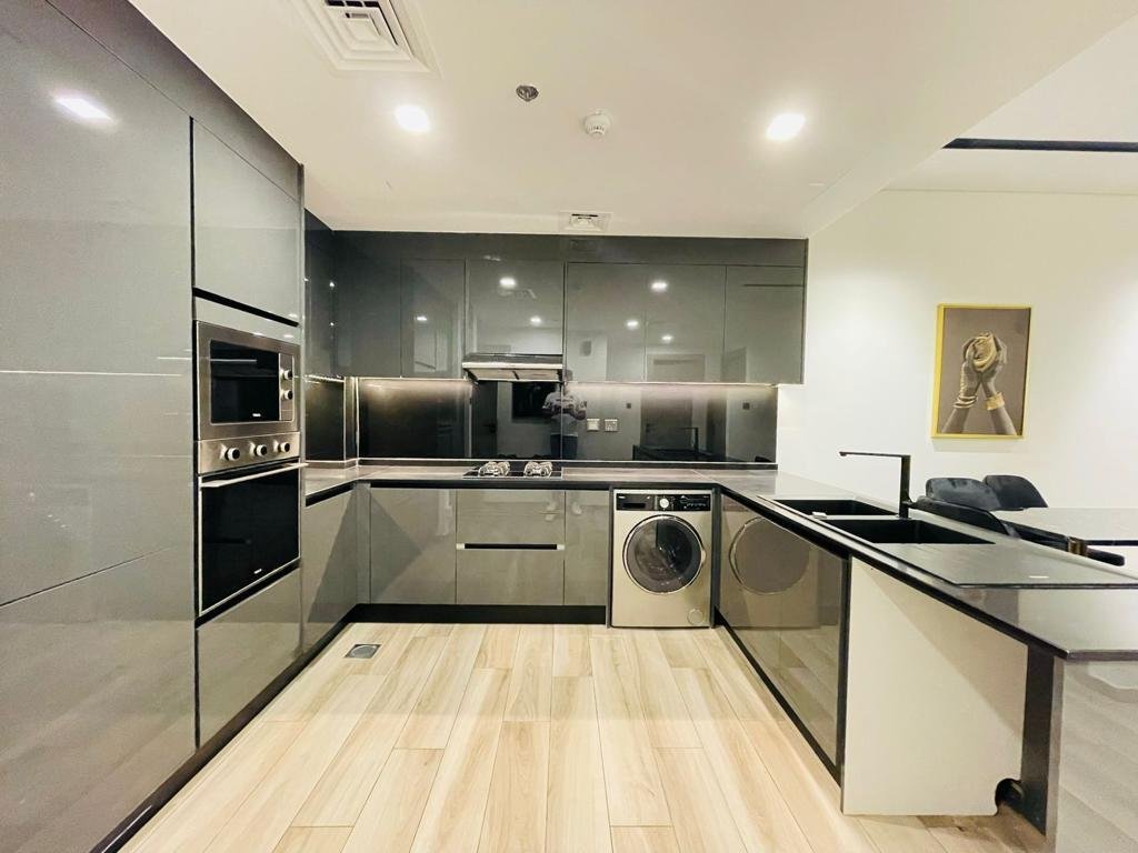 Die Küche ist in einer U-förmigen Anordnung mit zweifarbigem Schrankraum gestaltet, integrierter Ofen und Gasherdplatte, Unterbau-LED-Beleuchtung und einem in der aktuellen Aufstellung sichtbaren Edelstahlkühlschrank, was effiziente Arbeits- und Lagerfläche bietet. Die Oberflächen sind in neutralen Tönen mit Holzakzenten gehalten und vermitteln durchgehend einen einfachen, kohärenten Stil in der ganzen Wohnung. Eingebaute und Pendelleuchten in den Haupträumen unterstützen ein angenehmes, funktionales Interieur.