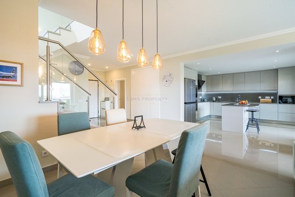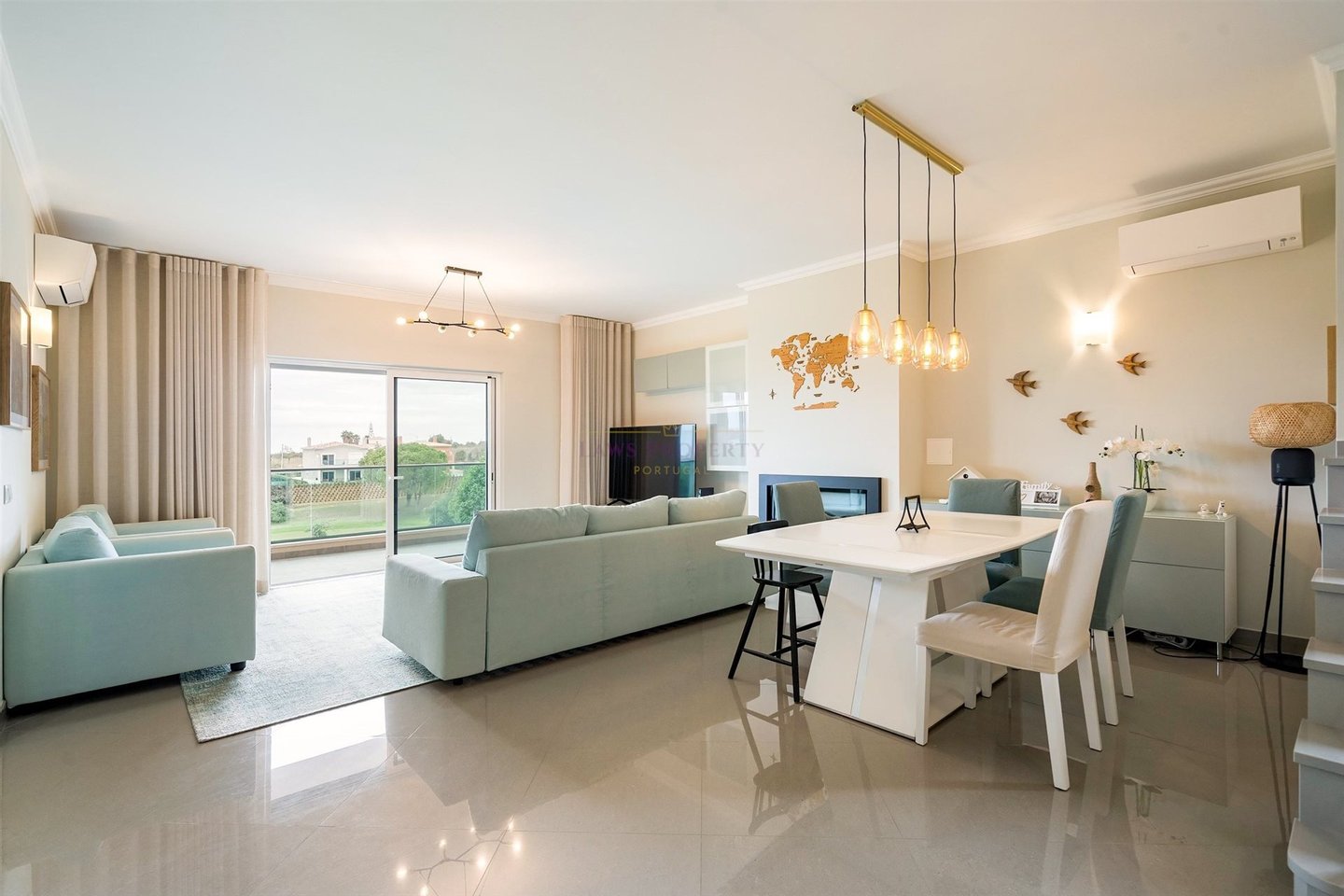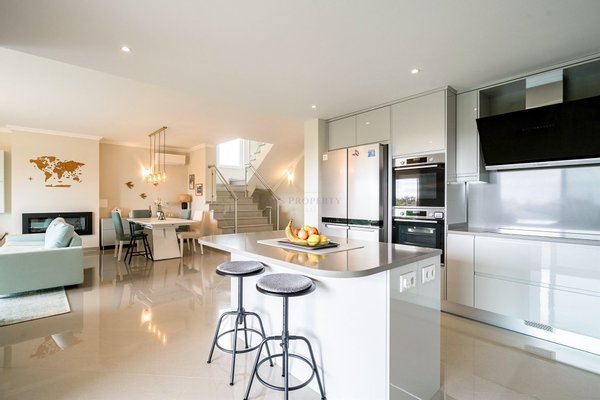 Durch die Südorientierung der Villa fällt natürliches Licht den ganzen Tag in diesen großzügigen Wohnraum und schafft eine helle und einladende Atmosphäre. Ein zeitgenössischer Gas-Feuerofen bildet einen markanten Blickfang und sorgt in den kühleren Algarven-Monaten für Wärme und Komfort.